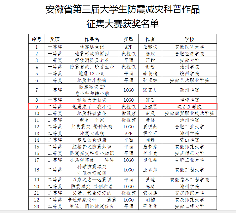 为全面贯彻习近平总书记关于防灾减灾救灾和科学普及重要论述精神,普及防震减灾科学知识,带动全社会参与防震减灾科普宣传,由省地震局、省教育厅、团省委、省科协组织举办的安徽省第三届大学生防震减灾科普作品征集大赛中,19级农业资源与环境专业的王淑贤同学带来的作品《地震来了,我不怕》在995个项目中脱颖而出,以第9名的优异成绩荣获省级二等奖,此奖项也是马鞍山市本科院校的首例。