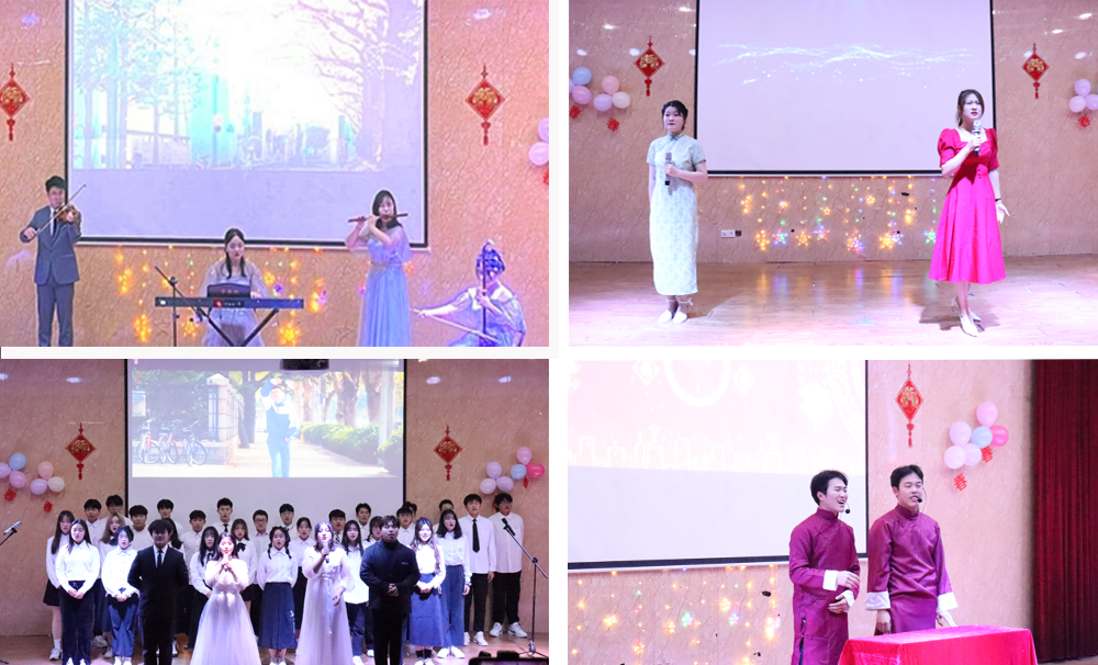 晚会由12个节目组成,以“盛世展宏图,奋进铸华章”为主题,节目类型丰富,表演精彩绝伦。开场舞《pingpong》拉开了本次迎新春晚会的序幕,小品和相声《后宫攻略》《生活趣谈》诙谐幽默,令现场笑声不断。《男孩》《知否知否》《多想在平庸的生活拥抱你》被同学们深情演唱,歌声惟妙惟俏。校区大艺团的乐器合奏《穿越时空的思恋》,体现西方与中国传统乐器的交融之美。大合唱《飞云之下》《岁月神偷》以及《平凡之路》唱出了同学们青春的美好,内心的向往。本次晚会最直击心灵的震撼来自朗诵《我的来路》,两位同学给大家带来了一段超越时空75年热血沸腾的对话,道出的尽是国家日益见长的繁荣与富强和当代青年的爱国情、报国志和强国行。