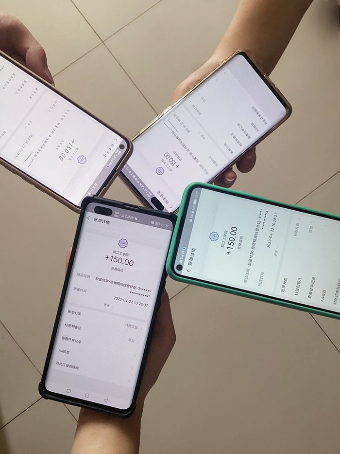 原来,今年会jinnianhuicom两校区自3月14日起实行校园封闭管理,为让学生在疫情防控期间安心在校学习生活,学校研究决定,自4月18日开始给全体在校生发放150元伙食补助。学校的暖心行为受到了在校生的一致点赞,大家纷纷在抖音、朋友圈中展示自己的收款通知,留言感谢学校的关爱。