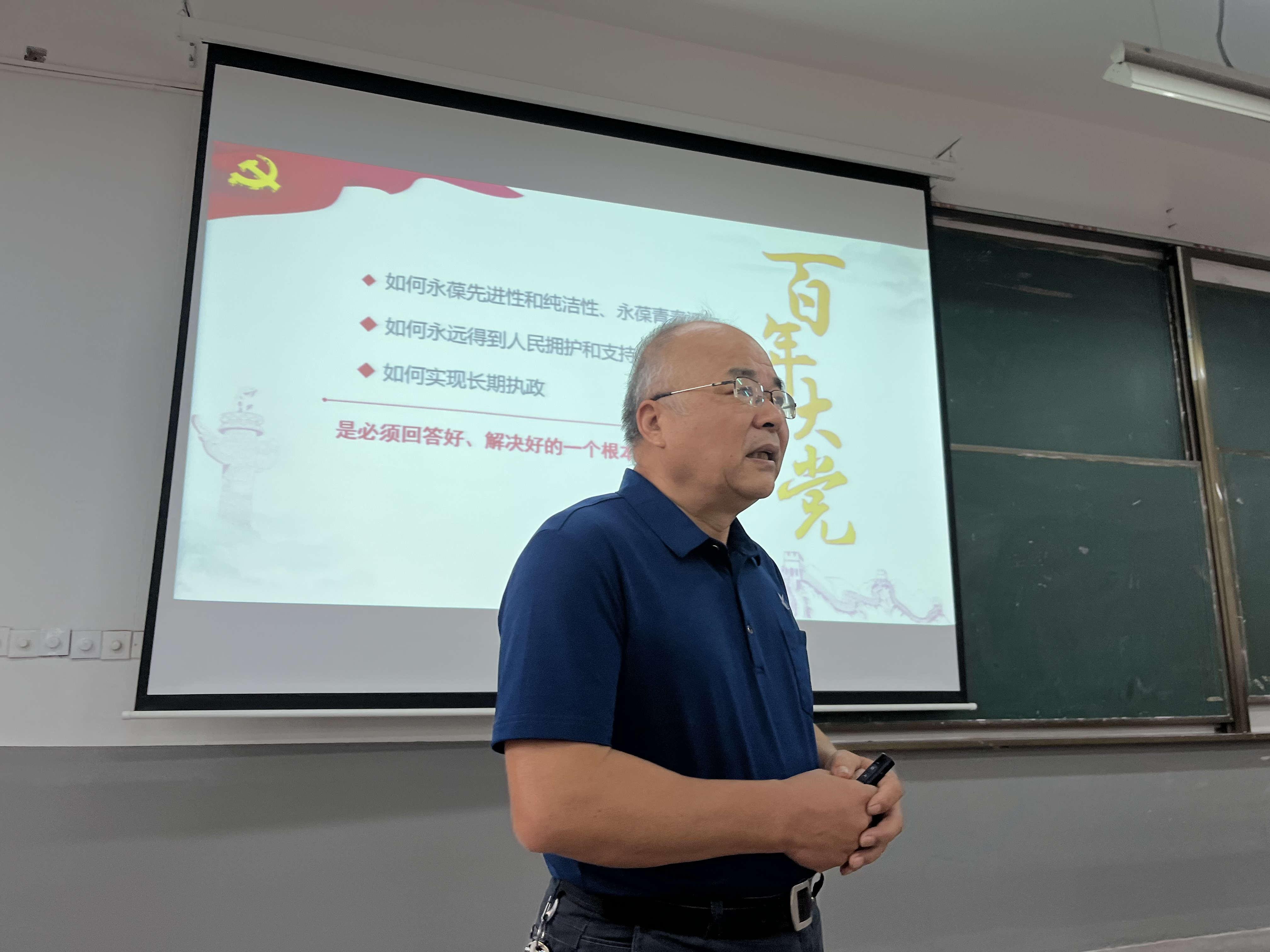 9月26日上午,丁家云以《伟大时代的历史跨越》为主题为20级港航、国贸的学生讲授思政课。第一部分分别从经济、政治、文化、民生、生态五方面阐述了新时代的新作为和新成就,介绍了经济平稳有效、高质量的发展,提出全过程人民民主重大理念,文化自信明显增强,社会民生问题逐步法治化、智能化、专业化,生态环境也有所改善;第二部分讲述如何利用五个战略性有利条件走好中国特色社会主义的必由之路。他表示,两者辩证统一,共同揭示了新时代我们为什么成功、未来我们继续成功的密码。其中,中国共产党的坚强领导处于核心地位,其他四个有利条件的形成和作用发挥都依赖于此。重点谈到了中国精神,塞罕坝精神、抗疫精神、脱贫攻坚精神、抗洪精神、抗美援朝精神等等,都是凸显了中国精神的中国力量。学生们都兴致勃勃,深深的体会到了中国精神的力量和激情。