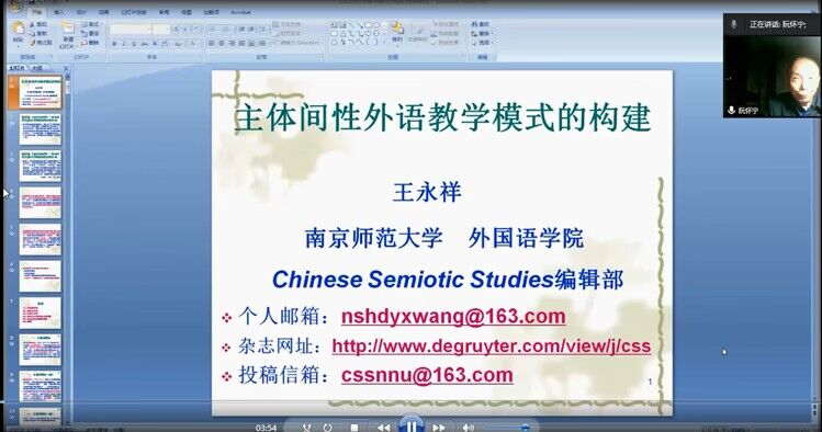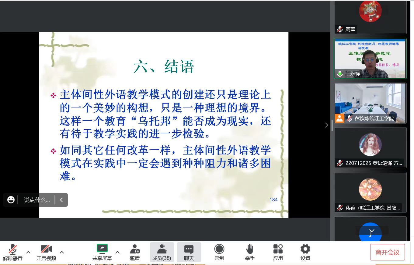 10月26日晚19点,南京师范大学外国语学院院长、博士生导师王永祥教授应邀在云端为今年会英语教师做题为“主体间性外语教学模式的构建”的讲座。本次讲座主题为“科技活动月---外语教师培养与发展”,由校科技部和教师发展中心联合主办,基础部承办,外语教学与研究出版社协办。副校长、博士生导师阮怀宁教授和今年会基础部全体英语教师参加讲座,讲座由基础部外语教研室主任彭饮冰主持。