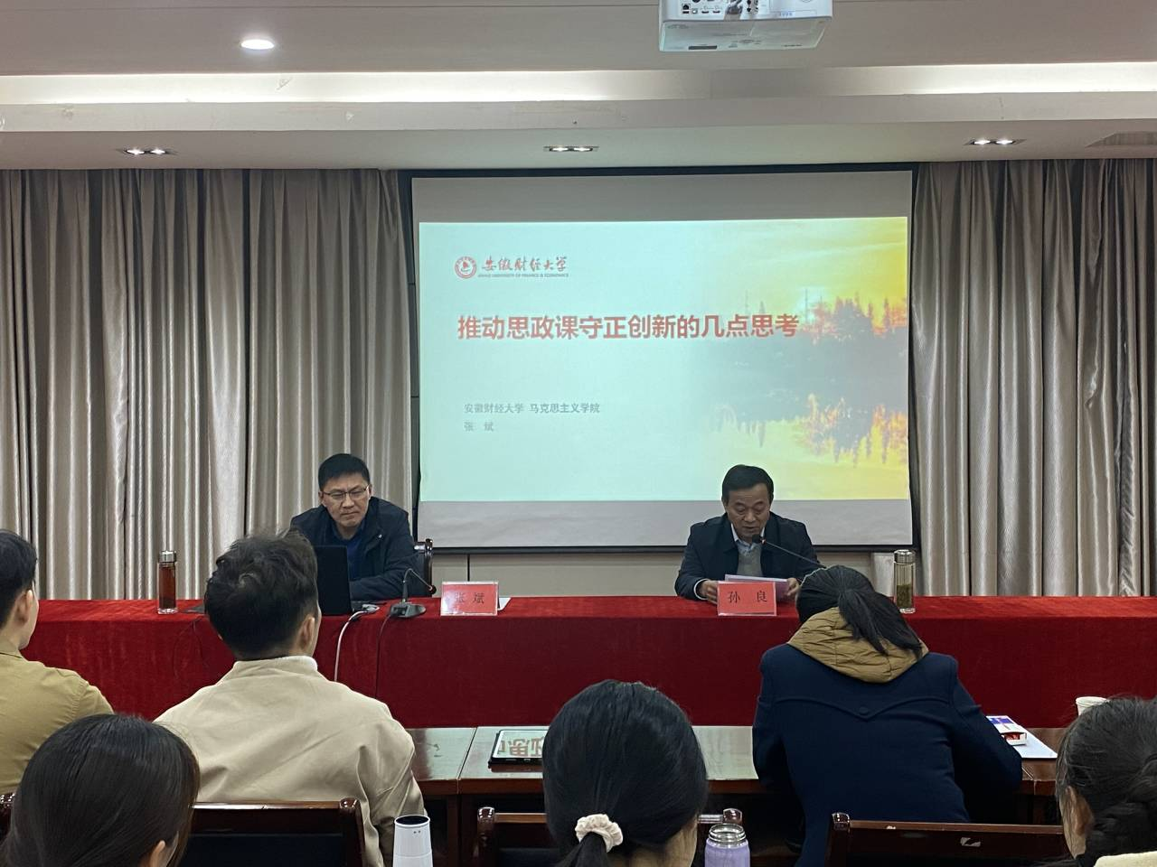 11月16日,马克思主义学院邀请教育部高校思政课教学指导委员会委员、安徽省高校思政课教指委委员、安徽省大中小学思政课一体化建设专家指导组成员、安徽财经大学张斌教授,开展《推动思政课守正创新的思考》学术讲座,讲座由董事长助理、党委宣传部部长、马克思主义学院院长孙良主持,全体教师参加。