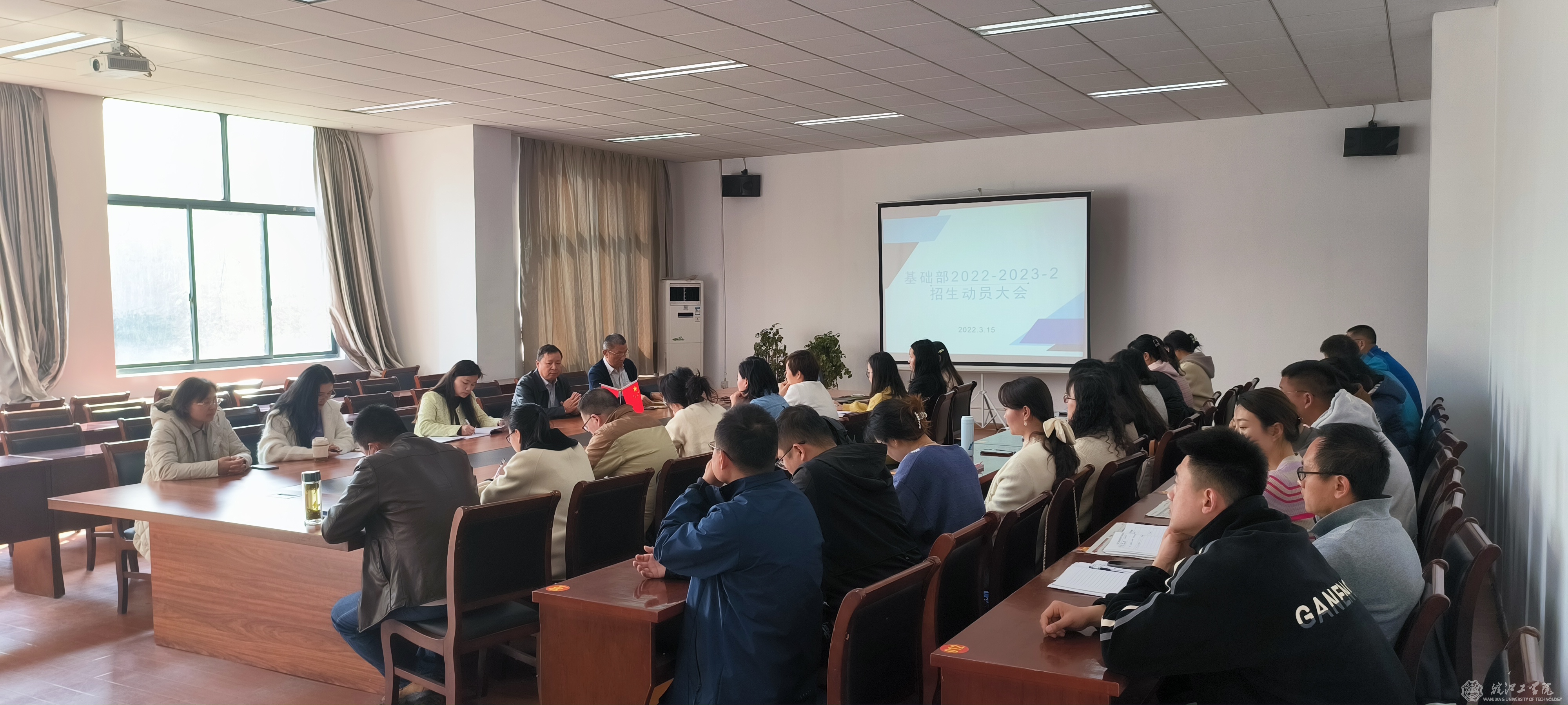 3月15日下午,基础部在E111会议室召开招生动员大会,副校长、基础部党总支书记侯进元,基础部主任余明江,主任助理毕胜琴,各教研室主任,及全体教师参加会议,会议由余明江主持。