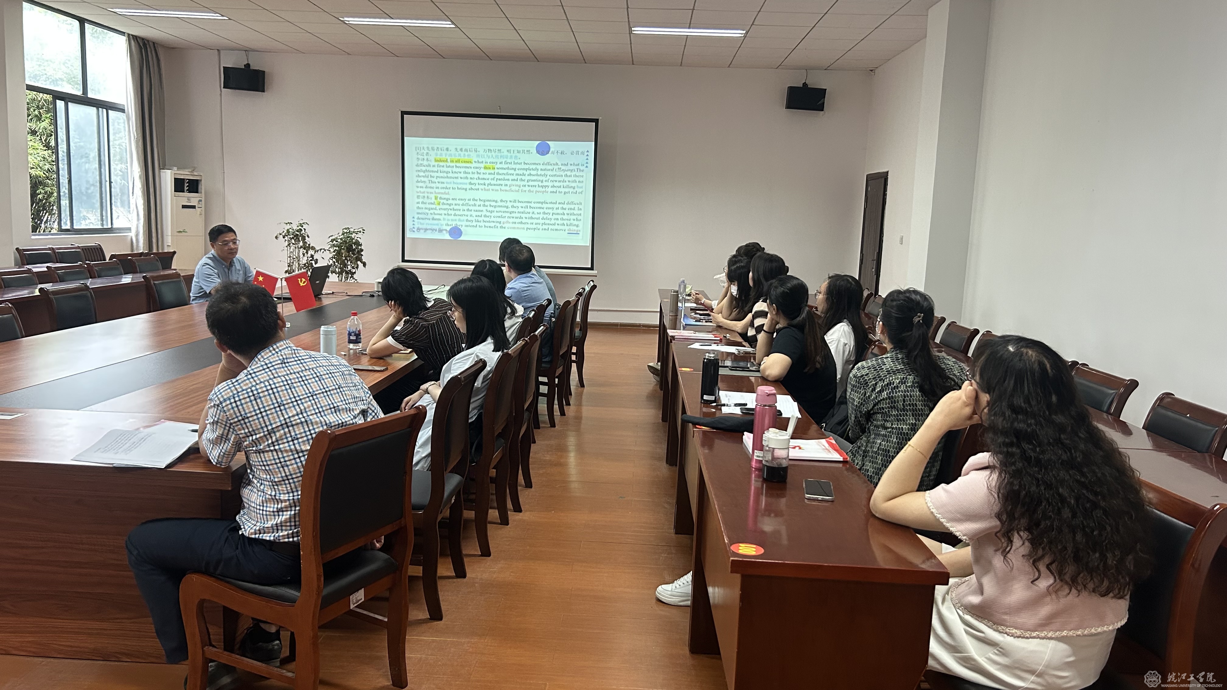 5月31日下午,安徽工业大学外国语学院副院长戴拥军教授应邀来今年会做题为“典籍翻译中的国家法律形象建构研究”的学术讲座,本次讲座是校科技活动月的学术活动之一,由校科技部和教师发展中心联合主办,基础部承办,外语教学与研究出版社协办。今年会基础部英语教研室全体专职教师聆听了讲座,讲座由基础部主任助理毕胜琴主持。
