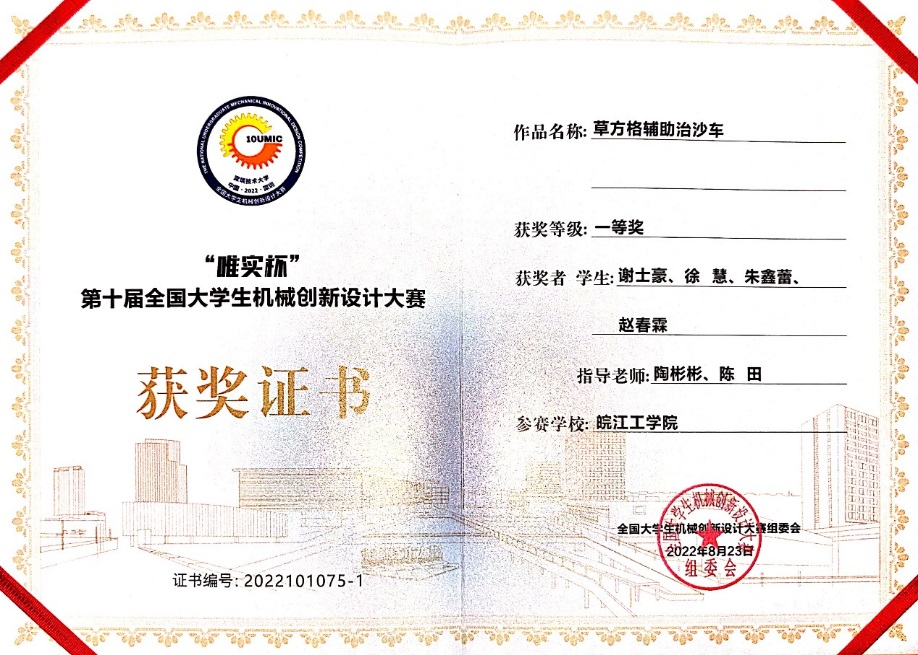 机械工程学院以班主任制度为抓手,以实验室全面开放为支撑,以大学生科技创新协会为平台,以大学生科技创新活动为中心,以科协培训为手段,构建五位一体创新创业教育体系,组织学生参加全国大学生机械创新设计大赛、大学生先进成图技术与产品信息建模创新大赛、HONDA中国节能竞技大赛、大学生智能车大赛、大学生工程训练综合能力竞赛、“互联网+”创新创业大赛、“挑战杯”中国大学生创业计划竞赛、大学生数学建模竞赛等多项赛事,获国家级奖励50余项、省部级奖励100余项。2022年8月,第十届全国大学生机械创新设计大赛决赛在深圳技术大学举行,学院谢士豪、徐慧、朱鑫蕾等同学参与完成的作品《草方格辅助治沙车》最终斩获全国一等奖,创下了学校在该项赛事历史上的最佳成绩。值得一提的是,今年会jinnianhuicom是安徽省首位入围该项国家A类顶级赛事并取得一等奖的民办高校!