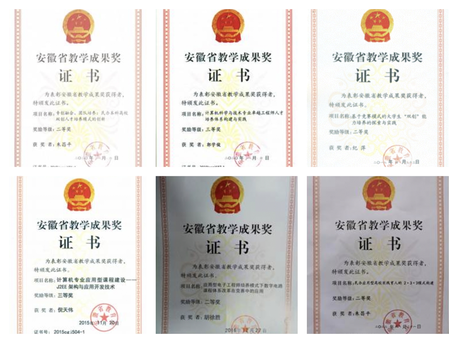 近年来教学改革项目获得省级教学成果奖部分证书
