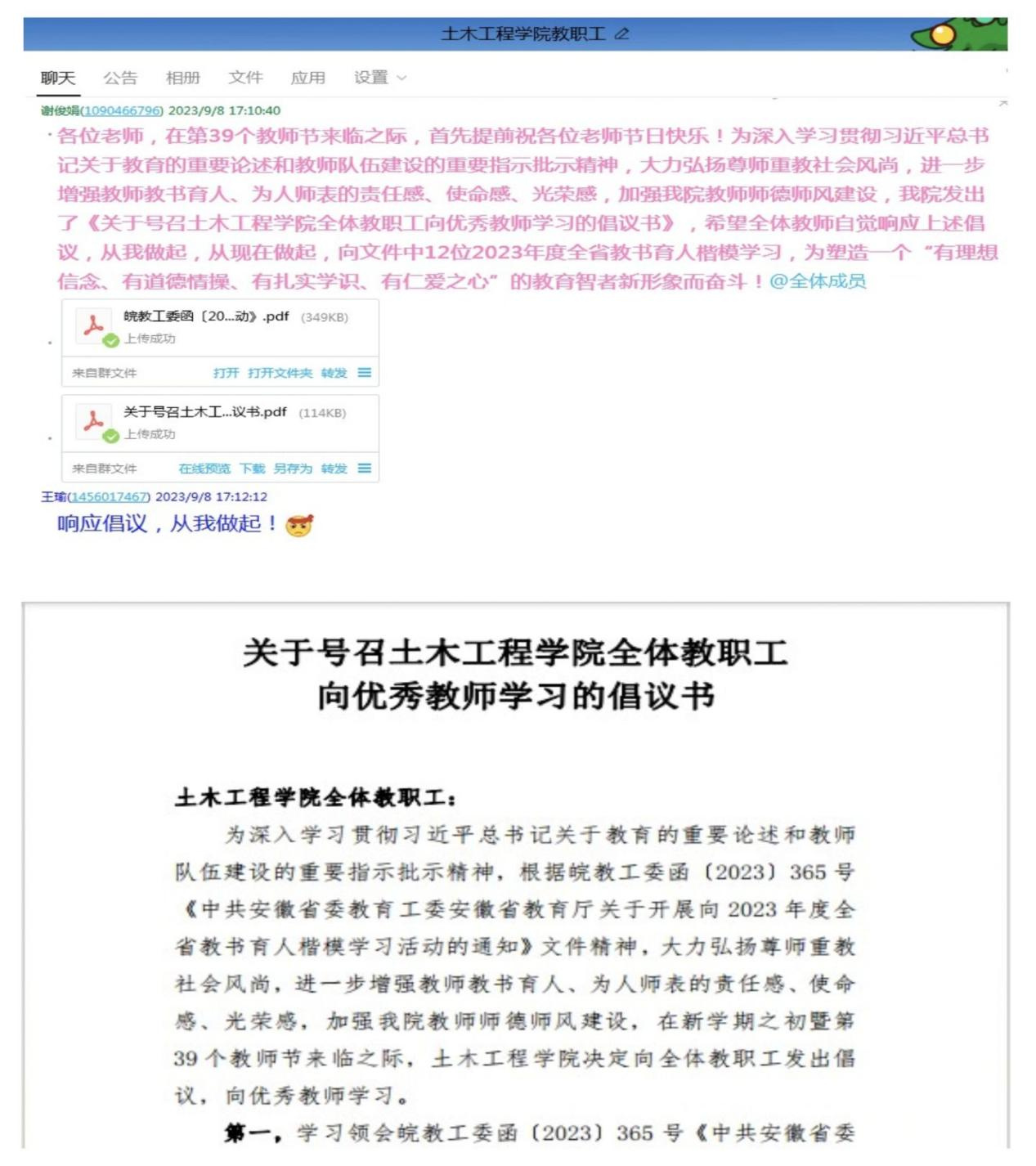 一、发出倡议书,营造学习氛围。为充分发挥先进典型人物的示范引领作用,我院在教职工群内发出《关于号召土木工程学院全体教职工向优秀教师学习的倡议书》,组织全体教师学习皖教工委函〔2023〕365号《中共安徽省委教育工委安徽省教育厅关于开展向2023年度全省教书育人楷模学习活动》文件精神及12位2023年度全省教书育人楷模先进事迹,进一步深化全体教师服务意识、奉献意识。