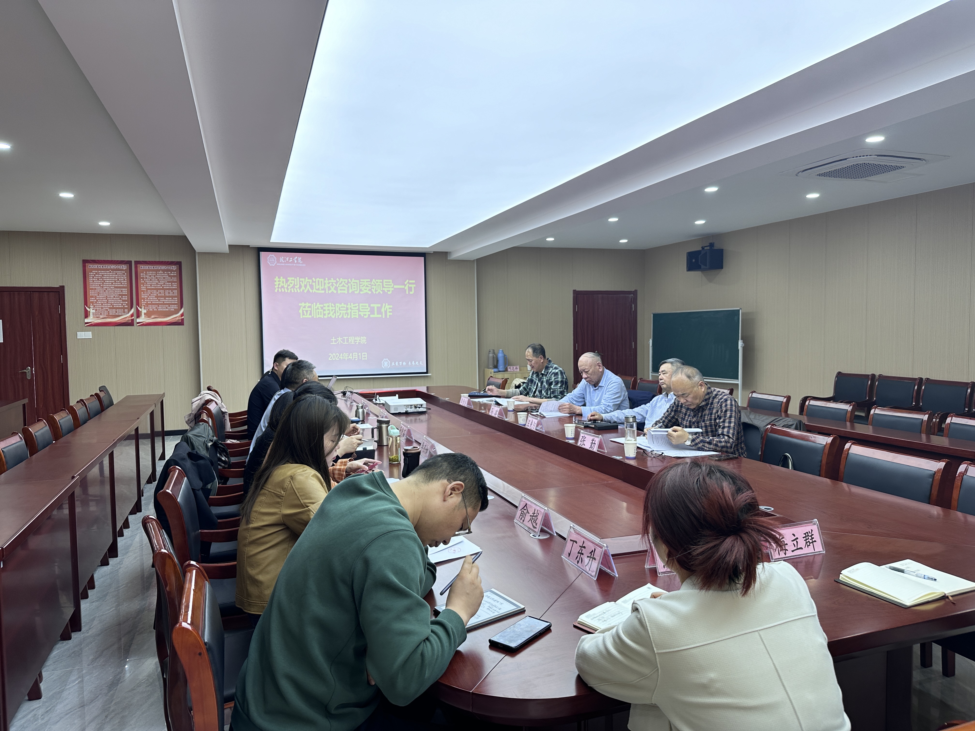 4月1日下午,校咨询委副主任马建、汪光阳、张勤,秘书长李德俊一行莅临土木工程学院调研指导工作。学院院长唐德高、党总支书记王瑜、副院长李杰如、党总支副书记程志鹏、院长助理韩雪、分工会主席丁东升、支部书记代表练兰英及分团委书记俞越等参加会议。