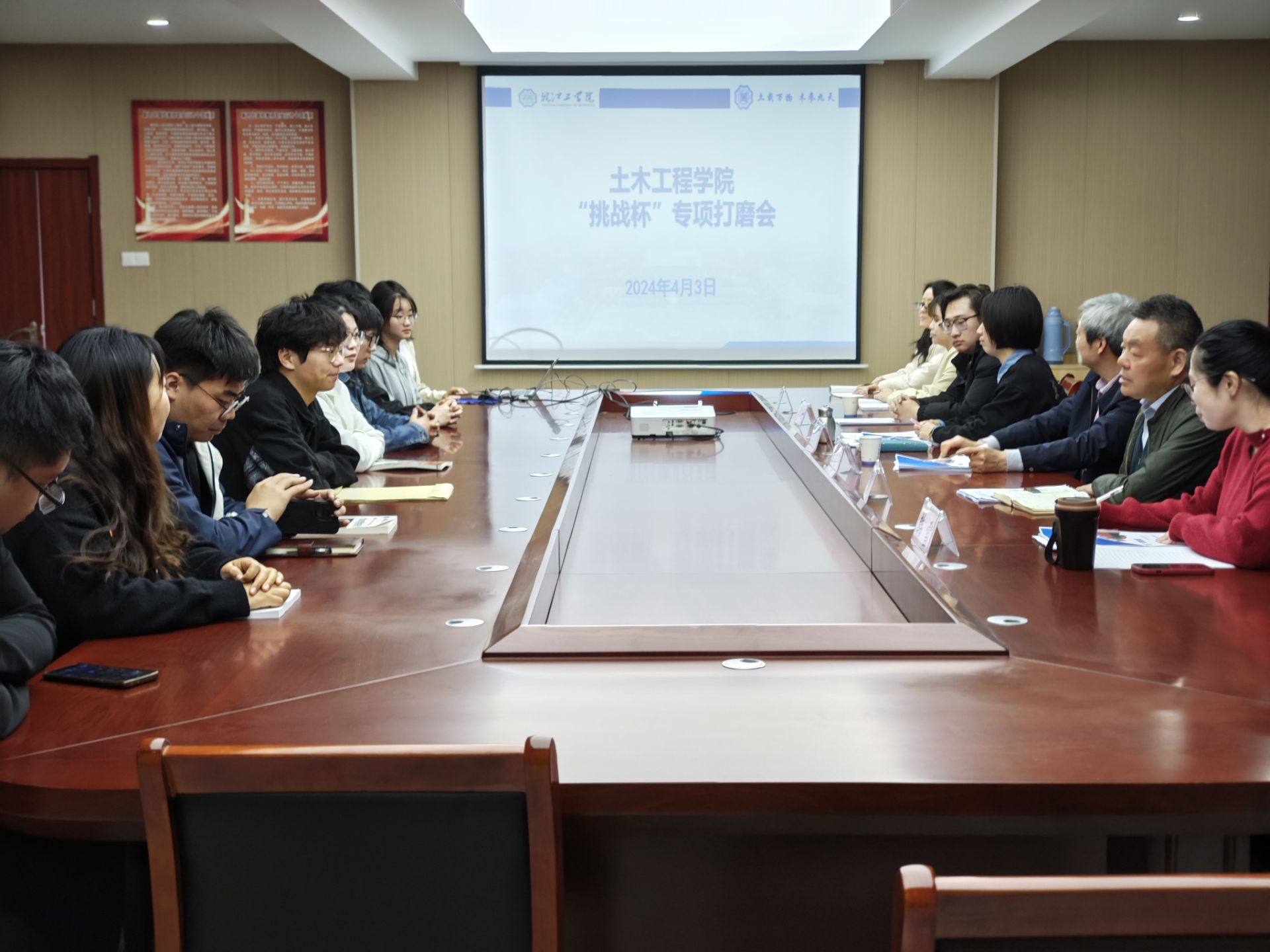 为提升学生的科研创新能力,激发学术热情,增强实践技能,4月3日上午,土木工程学院双创服务中心举办“挑战杯”作品专项打磨会,为即将参加挑战杯竞赛的学生们提供专业指导。会议特别邀请了创新与产业工程师学院院长朱昌平教授与周宇郝老师到会指导,院长唐德高、党总支书记王瑜、双创服务中心主任韩雪、副主任俞越、双创指导老师参加会议。