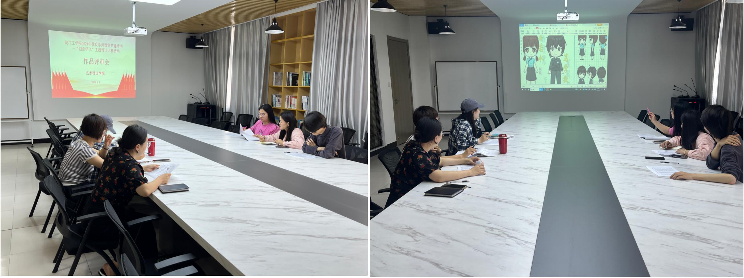作品收集整理历时一个月,分为海报设计、Logo设计、IP形象设计三个赛道开展。6月6日下午,学院组织评审团在洪雅楼203会议室对入围作品展开了评选工作,评审团由学院党总支副书记程楠楠、分团委书记刘慧、数媒教研室代明凤老师、产设教研室李蕊老师、环设教研室吴衍啸老师以及21级辅导员涂燕茹组成。评审老师们从作品的艺术表现力、创意内容、影响力等多个维度对作品进行综合评定。评选过程严谨公正,确保每一份获奖作品都是对学风建设主题的深度挖掘和完美诠释。