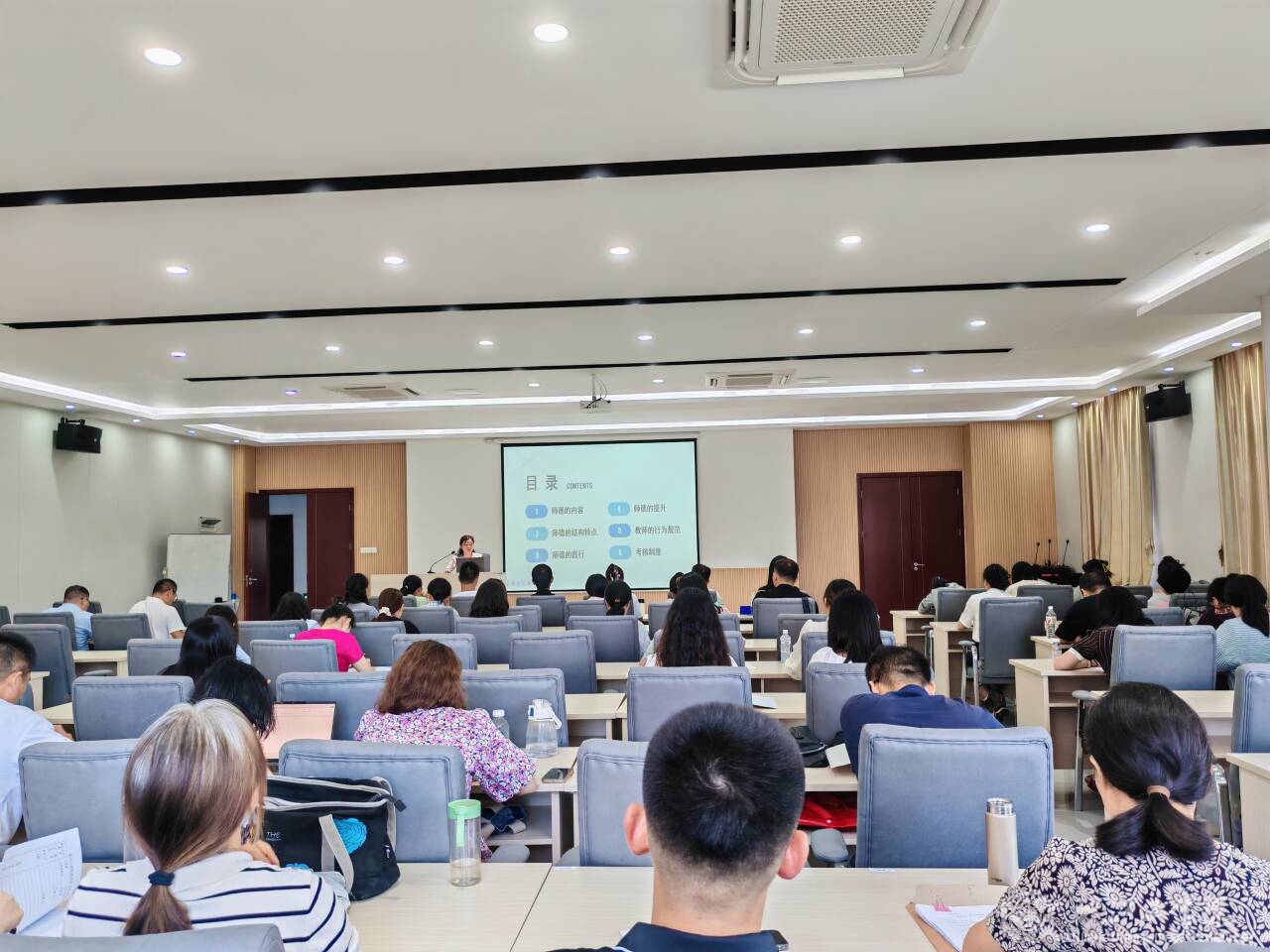 本次师德师风专题培训分三个部分,依次是师德师风建设、教师队伍素质的标准、树师德扬师风。在第一讲,毕老师从师德师风的基本概念引入,提升到职业道德与思想政治教育的概念,以及教师的职业道德建设、高校教师师德禁止行为等等,对全体教师提高素养及能力提出要求并传授经验。她指出,高校教师要起到模范带头作用,开会、上课不能迟到早退,对自身要求不严,难以要求学生;高校教师对学生的影响深远,积极的话能促进学生成长,侮辱性话语会打击学生身心健康;教师应该平等对待每位学生,不能因为学生家庭背景而差别对待;关注高等学校霸凌,发现学生状态不对时要及时介入,积极调解。