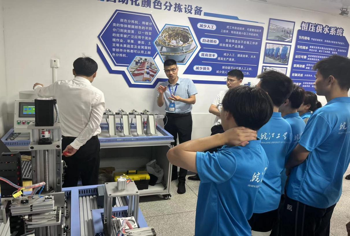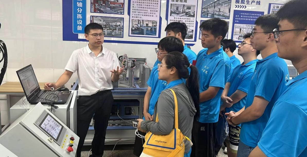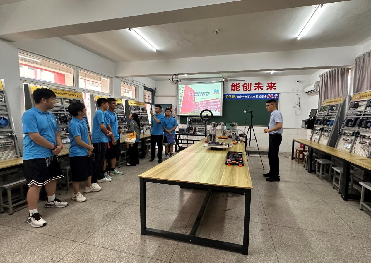 马鞍山明跃自动化科技有限公司的卢昌明老师详细介绍了这些设备的功能和操作方法,展示了如何通过编程实现对生产流程的精确控制。学员们在这里进行实际操作,将理论知识转化为实际技能。参观团队成员们饶有兴致地观察着学员们的实践操作,不时与老师和学员交流,了解他们在学习过程中的心得和遇到的问题。
