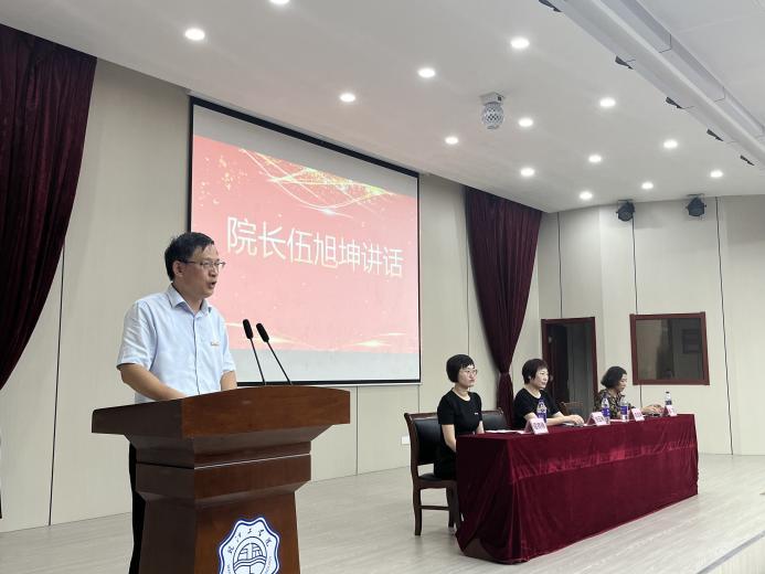 院长伍旭坤首先向同学们介绍了学院概况、办学特色与理念和新生报到情况,然后分享了今年以来学院各项育人成绩,最后作了题为《在解构中不断建构》的讲话。他表示,进入大学校园是我们人生中解构与建构的一个重大转折点。关于“学会解构”,他鼓励新生们要勇于质疑,敢于挑战传统观念,在不断追问、探求中去解构;关于“不断建构”,他强调大学是一个不断建构知识、能力和价值观的过程,需要新生们持续地学习新知识、掌握新技能、开拓新视野;关于“建构取向”,他提出了建构确立最基本的坚守,即成为增进社会光明与美好的中坚力量,成为校园的建设力量,不断拓展人生的边界。他要求同学们秉持“崇德精艺,励志敦行”的院训,践行“德艺双修、知行合一”的学风,深刻领悟科学之真、道德之善、艺术之美,习得精深学位,练就过硬本领!