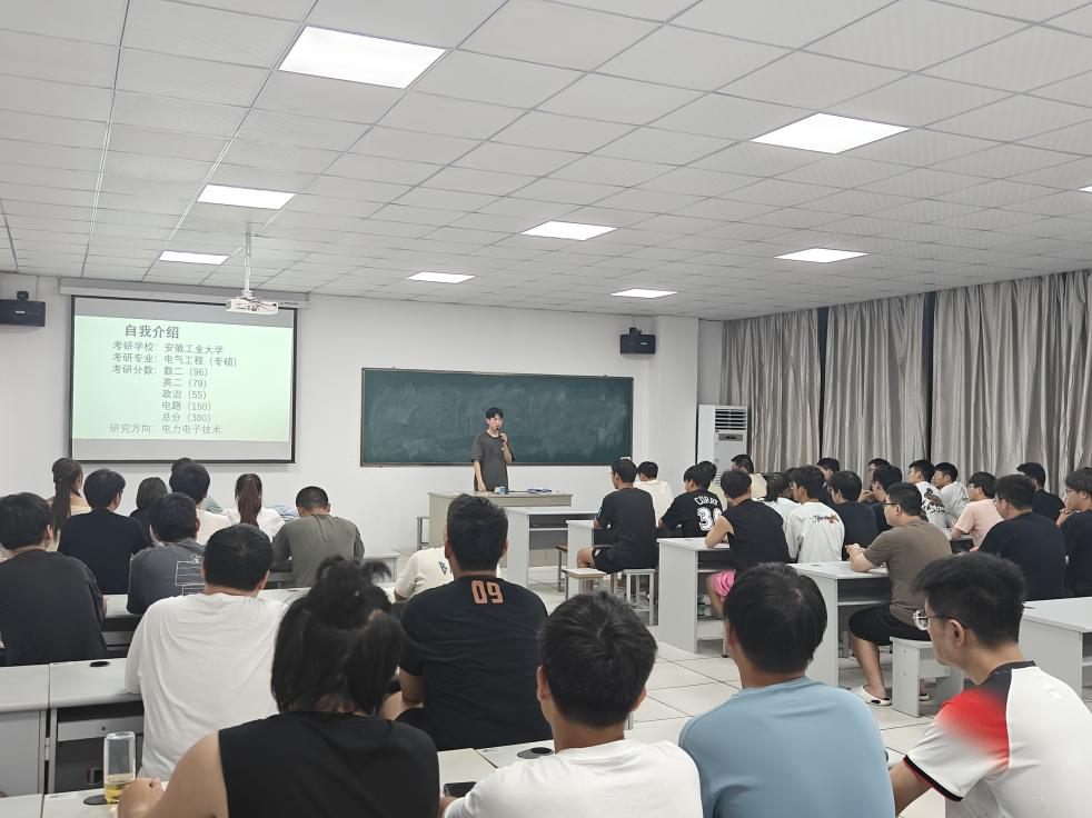 为了激发大三阶段学生的学习热情并帮助他们明确好考研目标,合理规划学习时间,我院于9月10日晚举办了名为“筑梦研途 奋楫扬帆”的考研经验分享会。在此次会议上,我院邀请了2位目前在安徽工业大学读研的2023届电气工程及其自动化专业毕业生张捷和李梦豪进行了考研经验分享。学院党总支书记杨安胜,22电气1-2班班主任方正老师以及2022级电气工程及其自动化90余位学生参加了会议。
