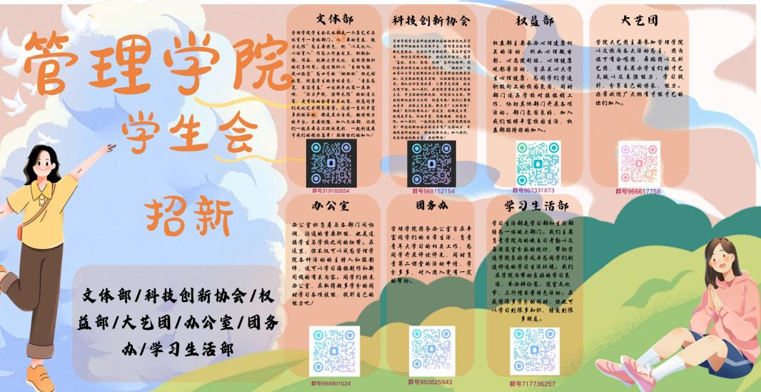 为壮大管理学院学生干部队伍,促进2024级新同学充分了解学院学生会各部门的职能与工作要求,9月21日,管理学院学生会举办了线下的招新活动。为确保这次招新活动能够顺利进行、给大家带来一次难忘的体验为目的,管理学院学生会成员们都在全力以赴地准备着。