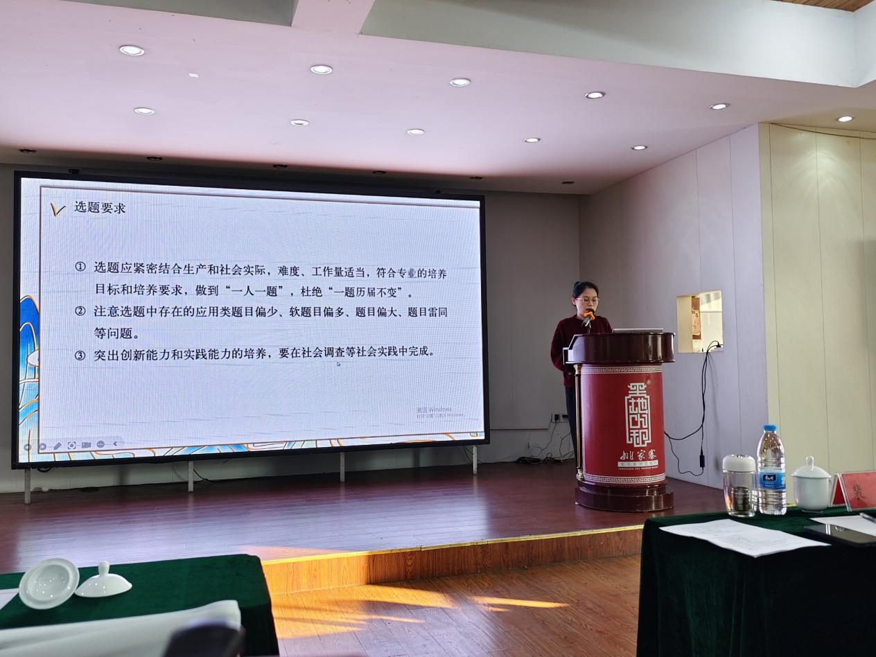 结束各教研室分组讨论之后,学院教学科研办副主任王璞老师重点讲解了本科毕业论文相关文件,涉及选题、答辩流程、指导次数、注意事项等材料的相关要求,并提醒各位老师要严格按照文件要求规范论文指导过程。