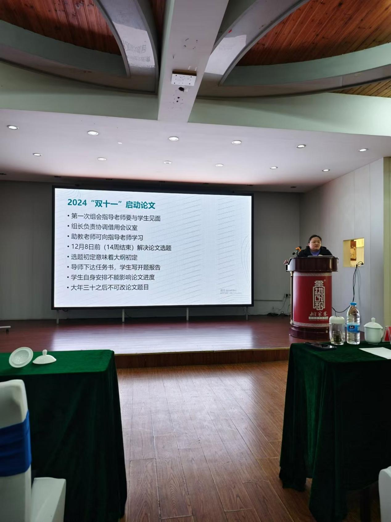 随后,院长助理副教授裴钦就本年度毕业论文时间安排做了详细解读,要求指导教师在指导学生论文过程中满足一定的见面交流时间,且按照时间节点,完成论文各个环节,并在论文系统中如实留下痕迹。