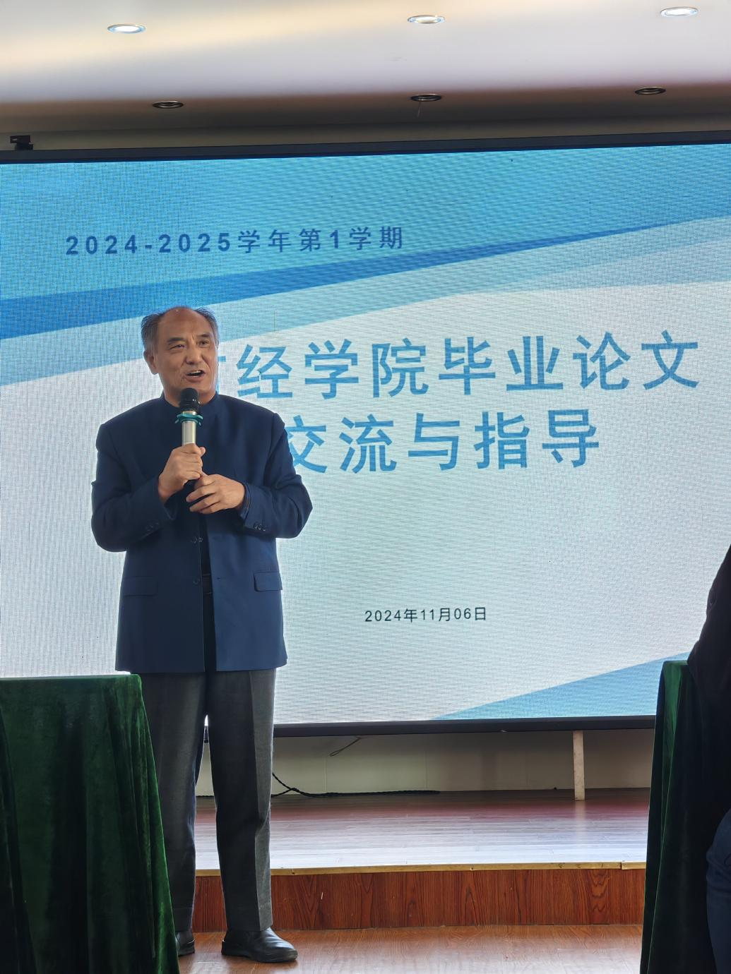 2025届本科毕业论文指导工作即将开展,为保证论文质量,迎接学校本科教育评估,2024年11月6日下午两点半,财经学院在姚家寨度假村酒店召开本科毕业论文指导交流会议,学院邀请了校党委书记丁家云,校督导组组员查会琼教授、财经学院督导组组长王锴教授,会议由院长助理裴钦老师主持,院长徐德信、副院长席彦群、各专业负责人及全体专任教师(含银龄)共计70余人出席了会议。
