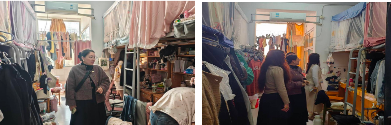辅导员涂燕茹、刘慧分别带领22级学生党员和21级学生党员进行宿舍安全卫生互查。检查过程中,映入眼帘的是党员们整洁的床铺、摆放有序的物品、干净明亮的地面,充分展示了学生党员在个人卫生和宿舍管理方面的自律精神与责任担当。老师们不仅仔细查看了宿舍的每一个角落,还亲切地与同学们交流,询问党员们在日常生活中的表现,以及同学们的学习生活需求。同学们既感受到了学院的深切关怀,也增强了自我管理的意识,还进一步强化了认同感和归属感。