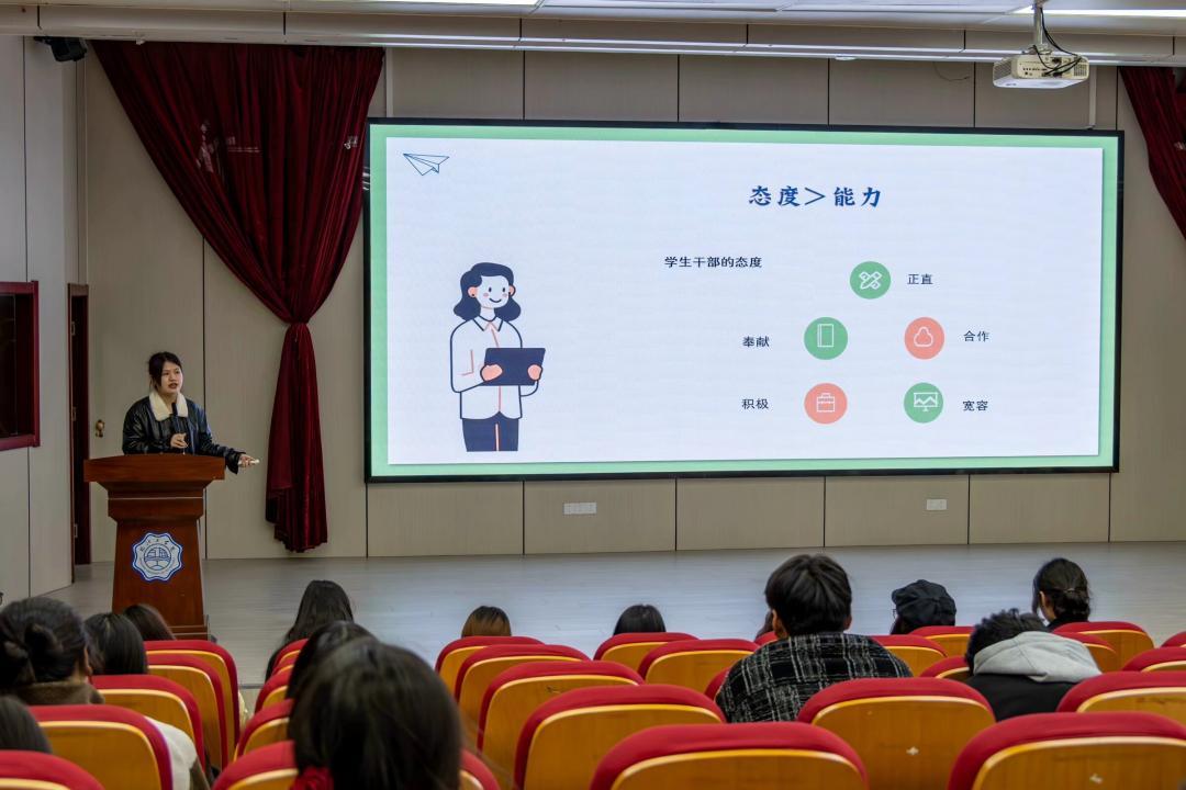 在培训环节,院分团委书记刘慧老师首先以“三会两制一课”和“挺膺担当”为主题,向24级干部们讲授了如何高效开展主题团日活动和如何提升学生干部综合能力。她对一年级的学生干部们提出了责任、初心、态度与创新的重要性,激励大家要勇于承担责任,积极行动,成为学院发展的重要力量。