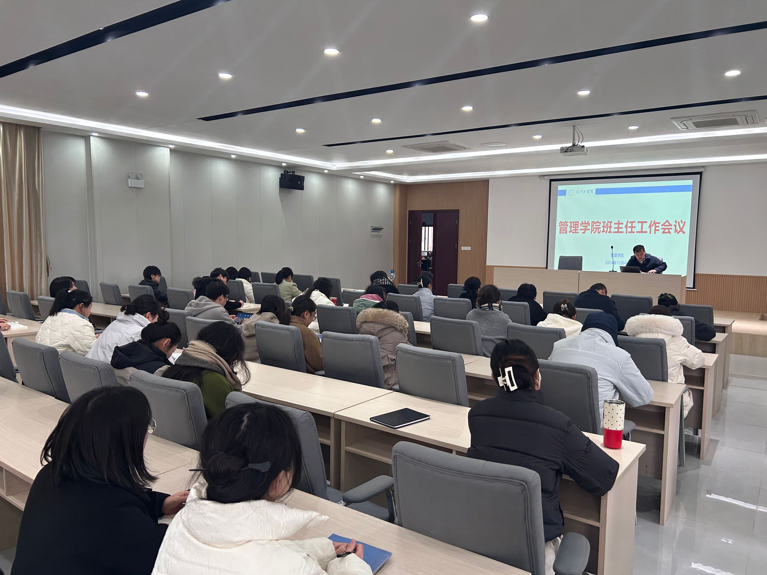 为进一步加强和改进班主任队伍建设,提升班级管理与学生教育工作质量,促进班主任之间经验交流与分享,共同探索新时代教育背景下学生全面发展的新路径,12月4日13:00,管理学院在弘毅楼209召开2024年期末班主任工作会议。学院党总支书记宋洪生、党总支副书记冯康、全体班主任老师参加会议。会议由冯康主持。