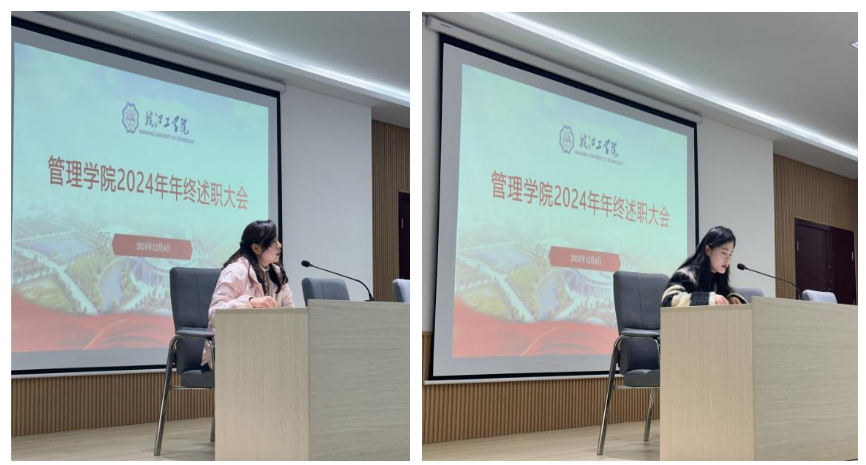 会议第二项议程为学院教职工依次做年度述职报告,全体教职工围绕各自工作,从德、能、勤、绩、廉五个方面总结2024年主要工作履行情况。各个教研室主任用数据客观展示一年来取得的成果,深入查找工作中存在的问题,并提出整改措施和下一年度工作计划。