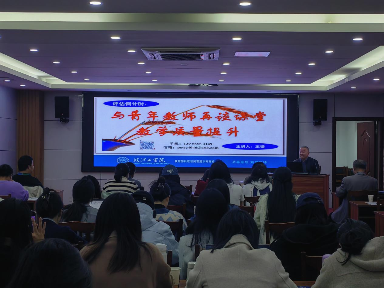 王锴督导以“与青年教师再谈课堂教学质量提升”为主题,从合格评估工作的指导思想、专家进校后“听课看课”关注点、财经学院督导听课过程中发现的问题、给财经学院青年教师的改进和提升建议四个方面对教学过程中存在问题进行指导与规避,向青年教师传达教学提升技巧。