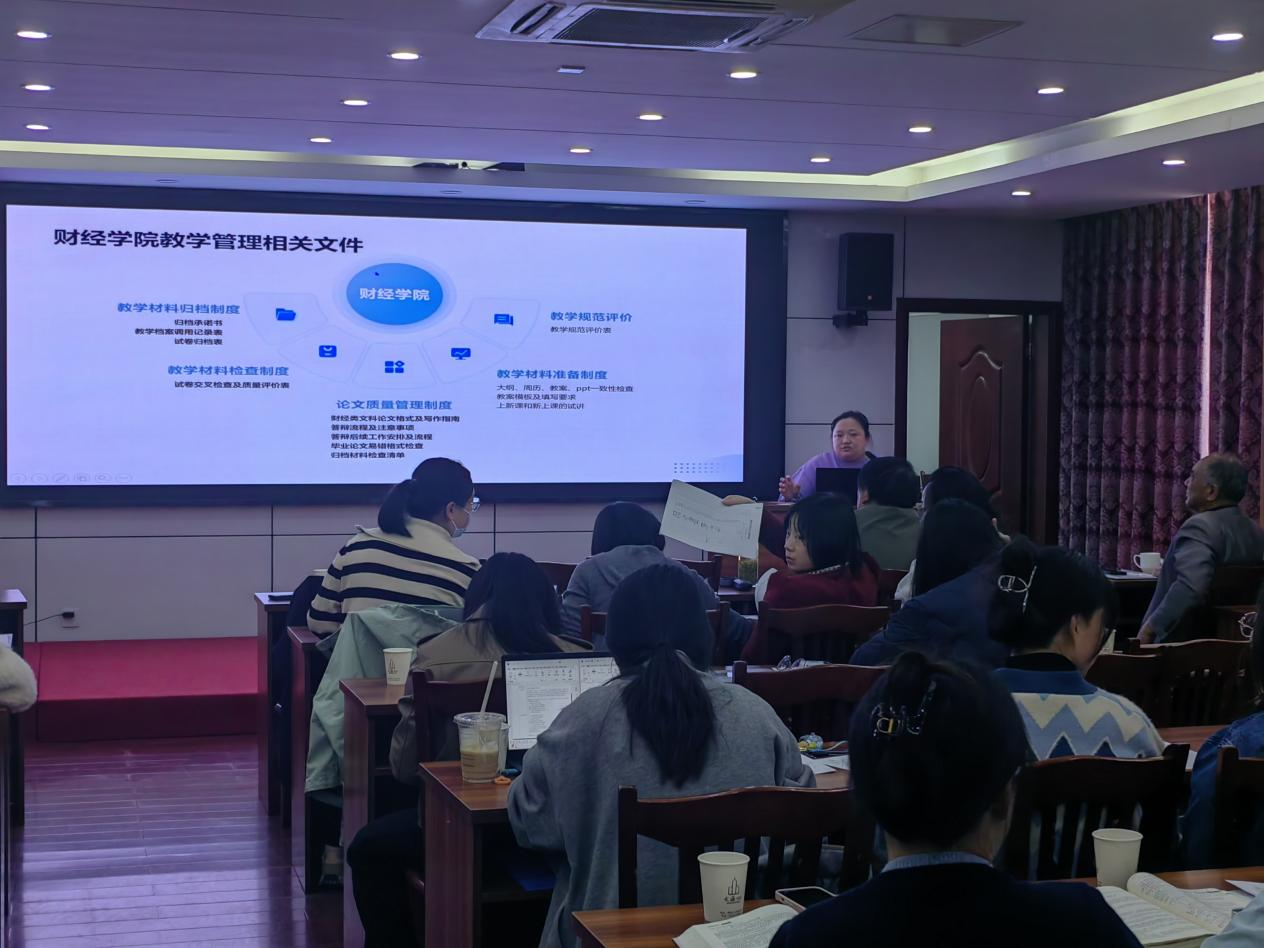 院长助理裴钦针对学校本科教学质量保障体系相关文件要求,介绍财经学院贯彻落实情况:教学材料归档制度、教学材料检查制度、论文质量管理制度、教学材料准备制度和教学规范评价,强调学院教师在教学过程中的责任感,树立教学事故规避意识。