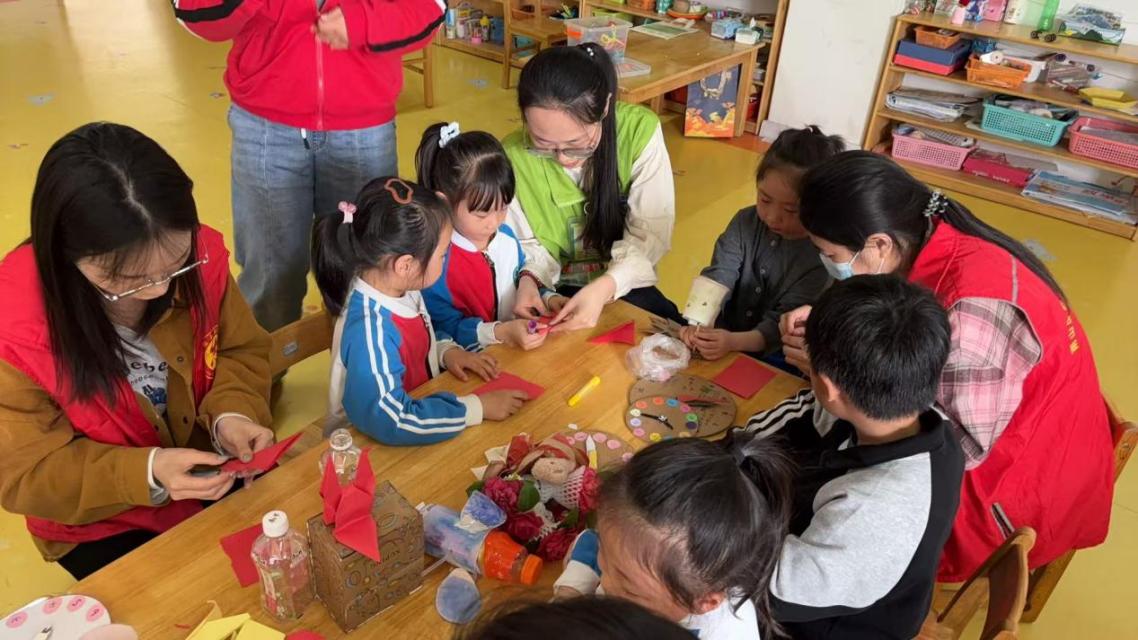 随后,志愿者们拿出提前收集的废旧塑料瓶、纸盒等材料,带领孩子们动手制作环保手工艺品。在“大手”和“小手”的协作下,塑料瓶被剪裁、装饰,逐渐变成五彩斑斓的花盆和笔筒;纸盒经过折叠粘贴,化身为收纳盒或小汽车,学生志愿者们用年轻人的创意点燃了孩子们对环保的兴趣。
