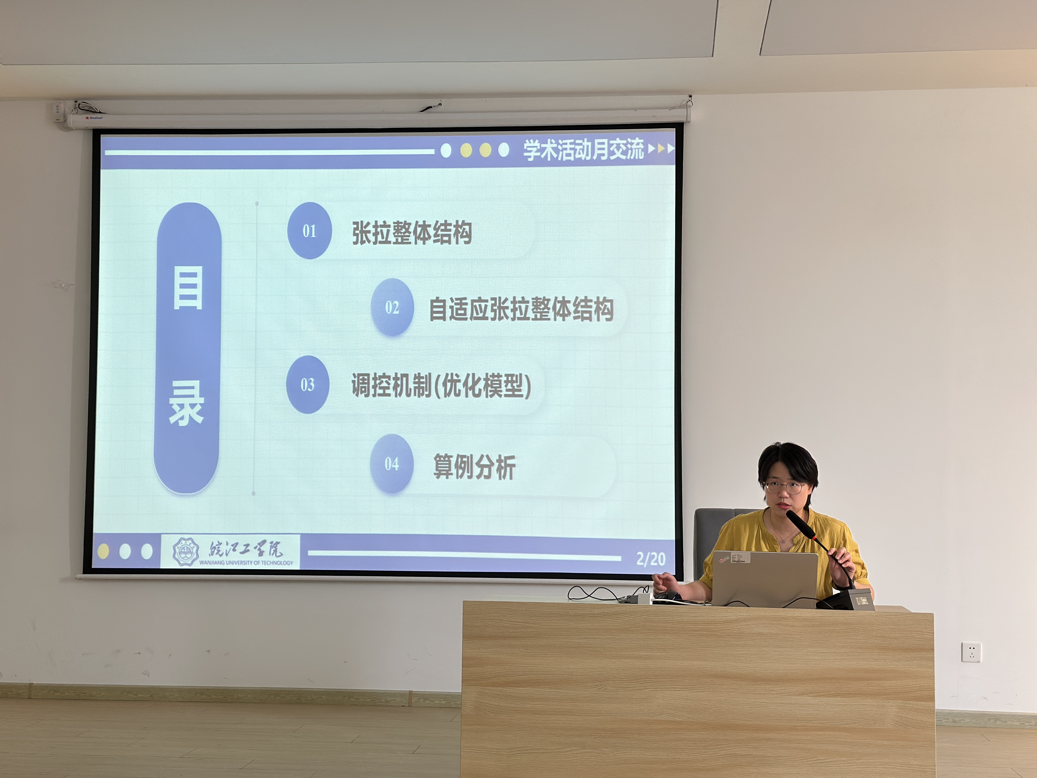 在经验分享环节,力学与工程材料专业教师熊慧婷聚焦于自己研究的自适应张拉整体结构形态调控机制,从张拉整体结构、自适应张拉整体结构、调控机制(优化模型)、算例分析等方面对该研究内容进行了系统介绍。