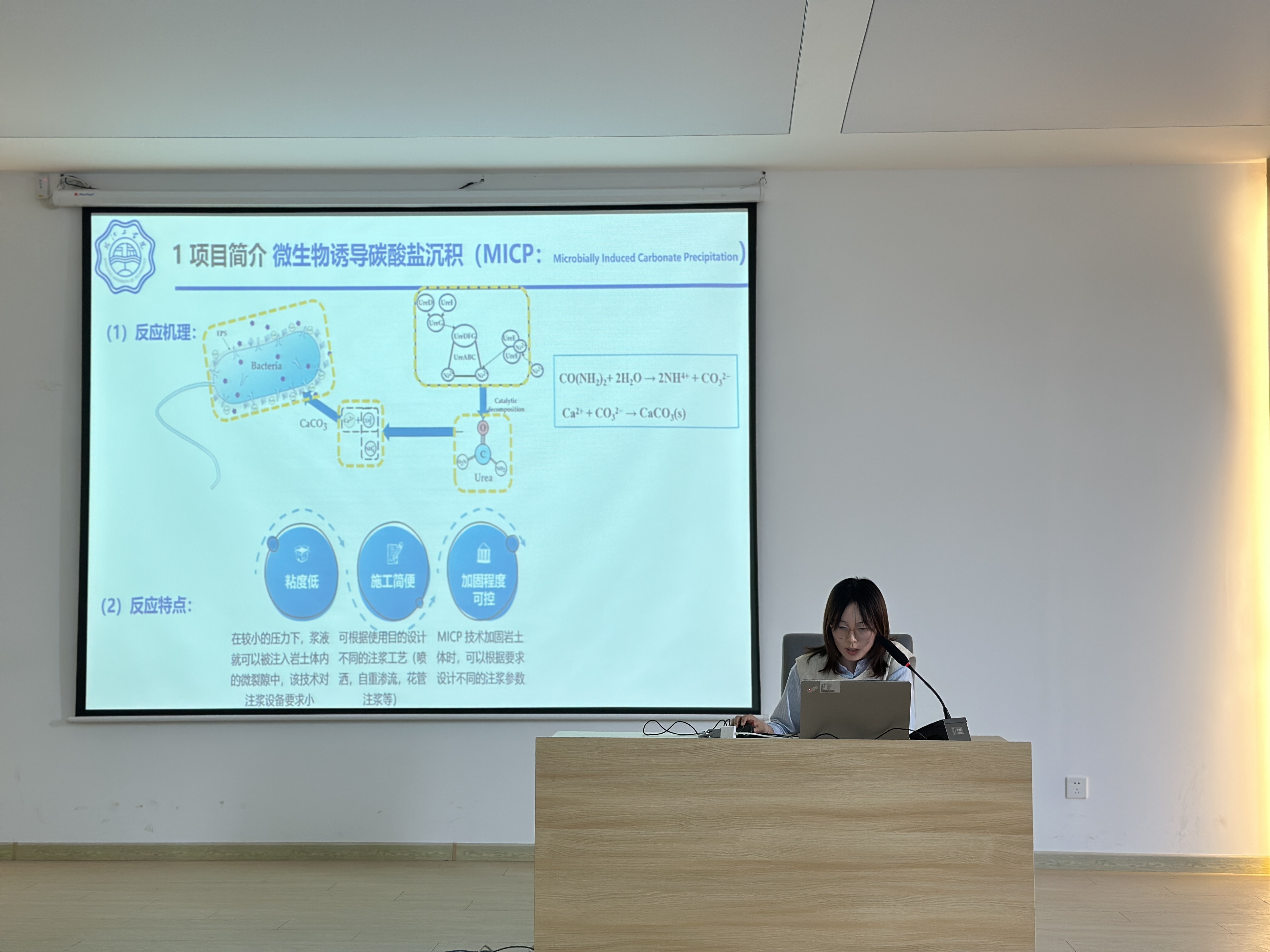 工程结构专业教师朱瑾以《外加剂提升MICP固化效果的机理研究及其应用》为主题,分享了项目的研究背景、拟解决的科学问题、研究计划等内容。