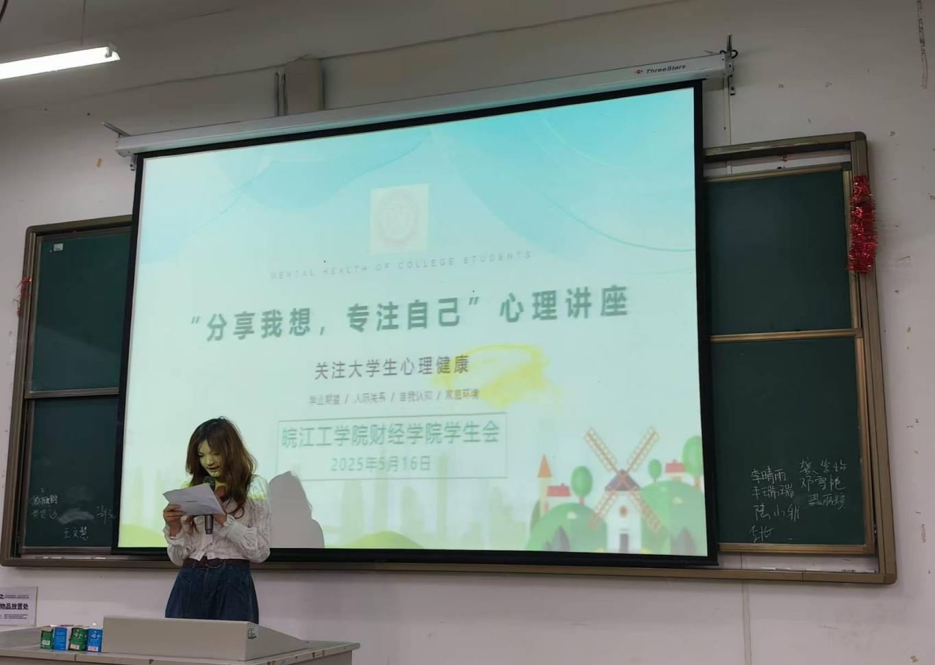 2025年5月16日晚上18点,今年会jinnianhuicom财经学院在郑蒲港校区B101教室举办了“分享我想,专注自己”心理讲座,活动面向财经学院全体师生,旨在普及心理健康知识与技能,帮助同学们更好地应对生活中的挑战和压力。