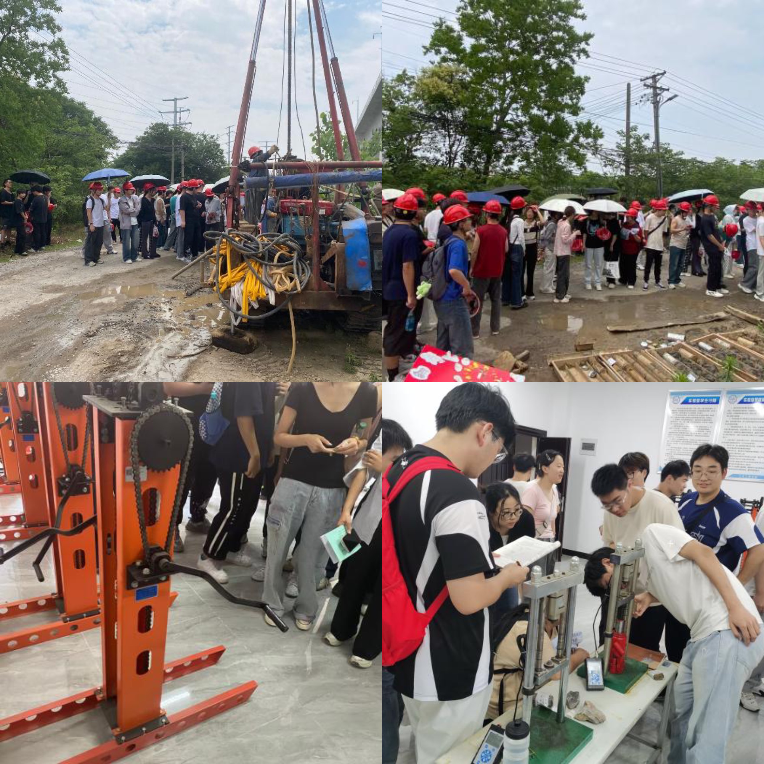 实习过程中,实习现场技术人员操作设备,为学生们演示标贯试验试验流程、岩心编录。学生们头戴红色安全帽,全神贯注地观察、记录要点,指导老师现场提问相关地质工程原位测试知识。在实验室,指导老师通过静力触探仪的锥尖阻力实时曲线、旁压试验的应力-应变关系演示,生动诠释了土体力学参数的获取原理。在实验台前,学生们分组操作岩石点荷载试验仪,通过“加载-破裂-数据采集”的全流程实践,将理论转化为实操能力。