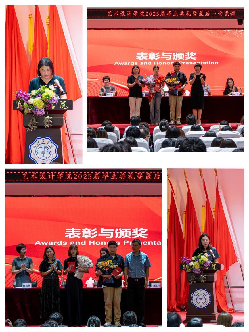 在表彰环节,荣誉与掌声交织。副校长朱建芬宣读《关于表彰曹哲、施艺同志为艺术设计学院荣誉员工的决定》,并与党总支书记张亚梅共同为已服务十年、贡献突出的两位教职工献花并颁发荣誉证书,致敬他们为学院发展倾注的心血;副院长金花宣读《关于表彰艺术设计学院2025年度“教学能手”和“教坛新秀”的决定》,院长伍旭坤与副院长金花为获奖的曹哲和刘梦水教师送上鲜花与荣誉证书,表彰他们在教学岗位上的辛勤耕耘与卓越贡献;副书记程楠楠宣读《关于表彰朱玉莹同学为艺术设计学院优秀学生党员的决定》和《关于聘任孙芷若等5名同学为艺术设计学院2025届校友会联络人的决定》,随后,党总支书记张亚梅、副书记程楠楠为优秀学生党员颁奖,院长伍旭坤与党总支书记张亚梅为校友联络人颁发聘书。