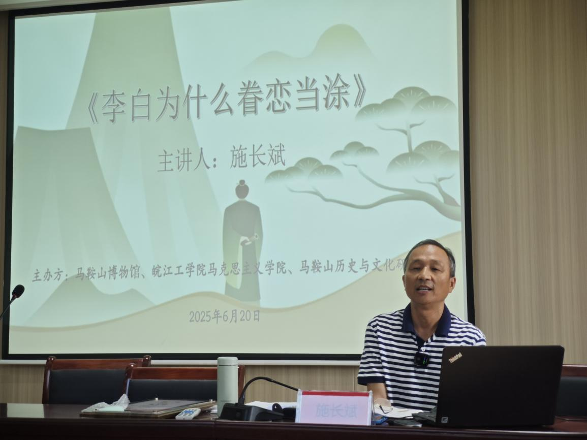 6月20日上午,安徽省作家协会会员、马鞍山市政协文史馆馆员、当涂县政协委员、中共当涂县委党校四级调研员施长斌到马克思主义学院多功能会议室作《李白为什么眷恋当涂》讲座,马克思主义学院总支书记陈毓陵,常务副院长刘双,教学副院长胡耀东、教研室主任及马克思主义学院全体教师参加。会议由刘双主持。