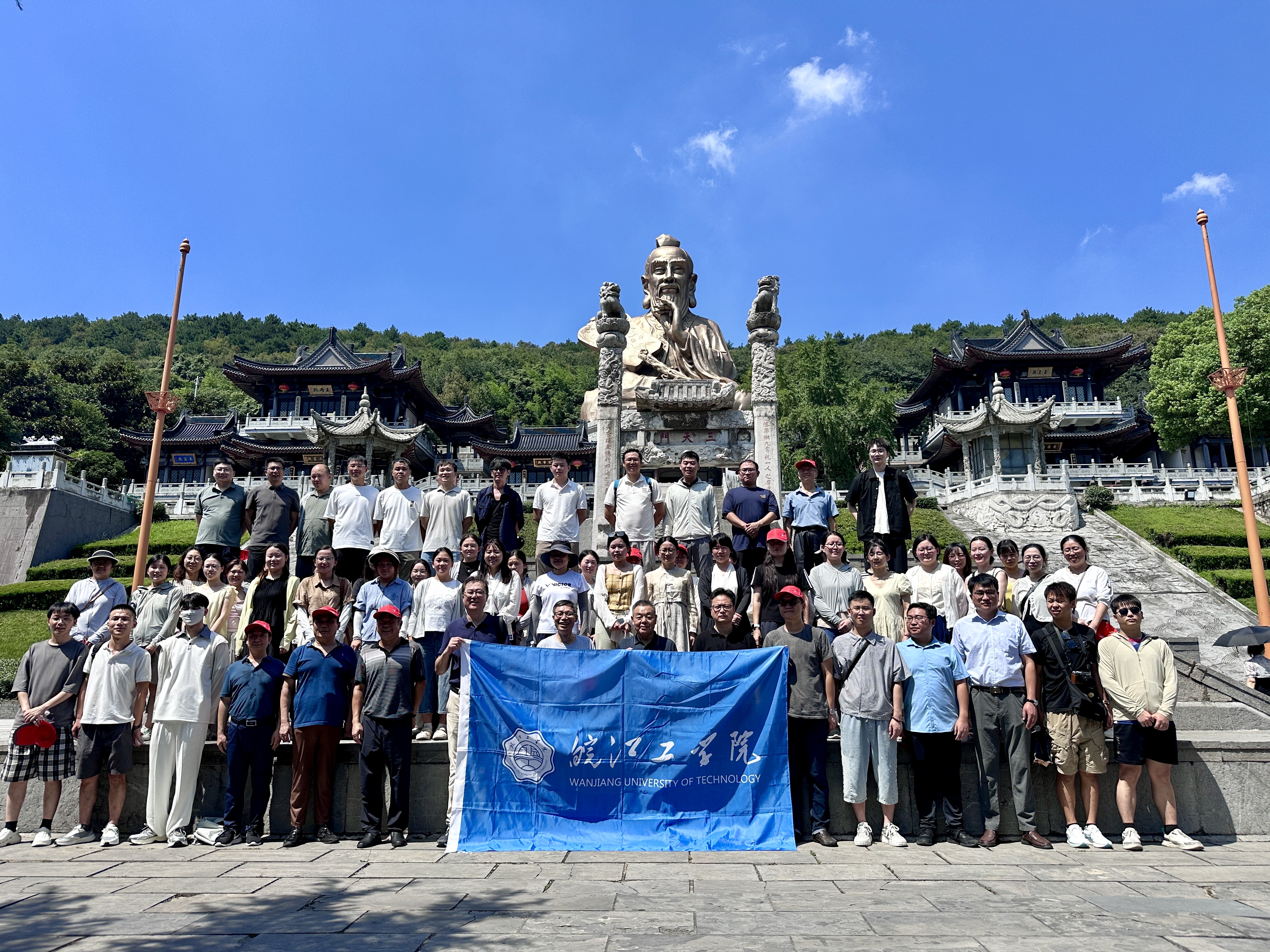 作为承载深厚道家文化的重要发源地,茅山千年积淀的文化底蕴与学校 “上善若水,笃学敦行”的校训精神形成深刻共鸣。在专业讲解员的引导下,教师们先后参观了老子神像、太极广场等文化地标,深入领悟了“天人合一”、“道法自然”、“水利万物而不争”的哲学思想。