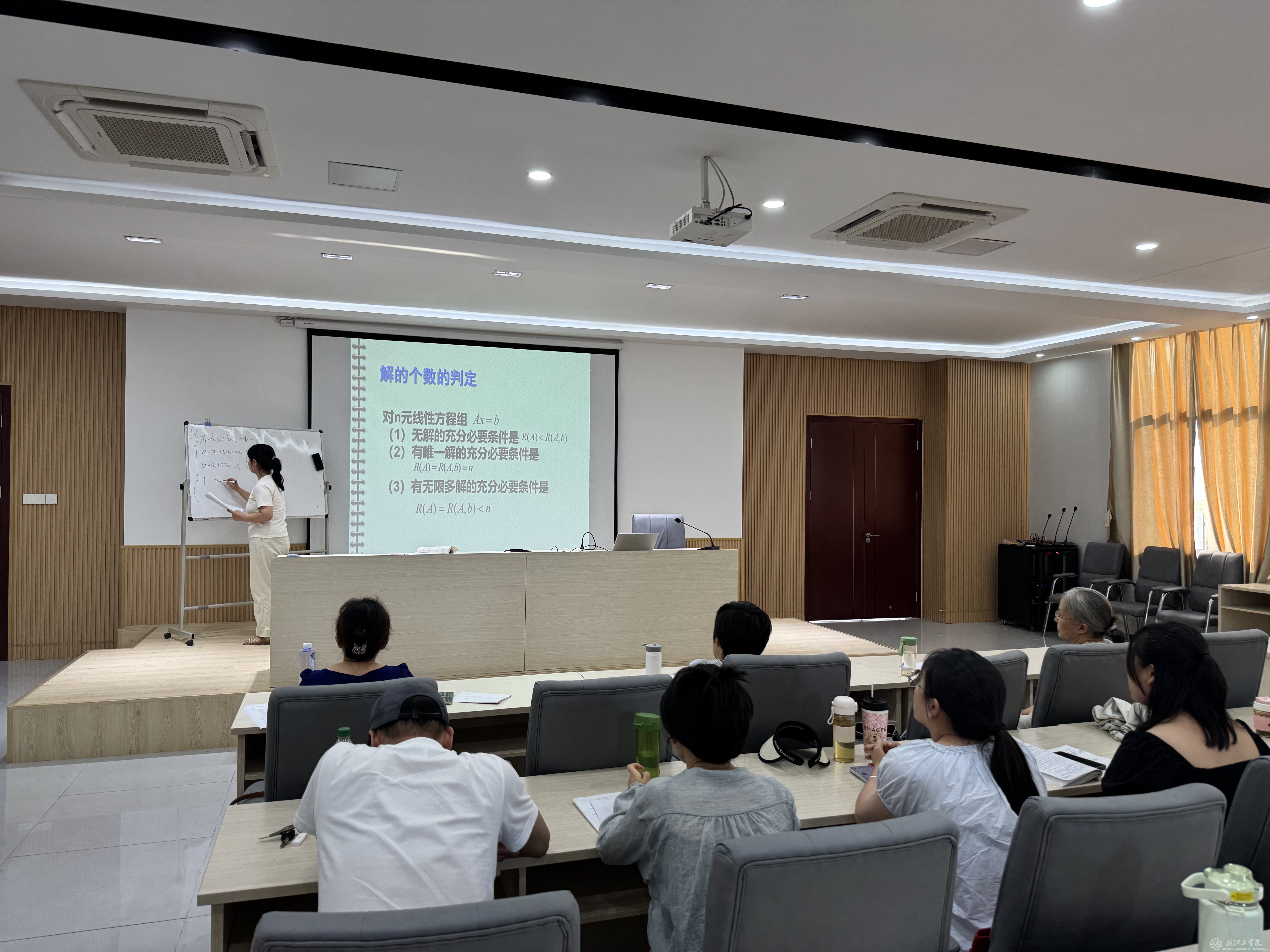 研讨会后紧接着是磨课活动,本次活动主题聚焦线性代数和高等数学,魏玉琰、王新雨、李灵毓秀、谭珺嘉和耿瑞娟五位新教师进行教学展示。范爱华主任领衔的资深教师点评组建议:课件PPT突出重点,关键知识点加粗,动画有序播放;课堂导入丰富多元,控制语速增强感染力;黑板板书规范符号,清晰划分重难点,增加基础例题讲解。