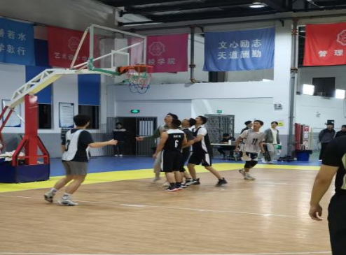 赛前氛围早已被精心烘托:电信工程学院学生会自制的“师生同心,赛场同行”红色横幅醒目悬挂,字字传递着对赛事的期待与师生同心的信念。教师球员与学生对手提前在场边互动,或是探讨战术细节,或是调侃彼此球技,轻松的谈笑间,师生间的距离悄然拉近。随着裁判一声清脆哨响,比赛正式开场——教师队身着黑色球衣,凭借老道的赛场经验与默契配合,以沉稳传球、严密防守掌控节奏;学生队则以白色球衣为标识,带着青春的冲劲与敏捷身手,在赛场上来回奔袭,快速突破、积极抢断,用蓬勃活力直面“挑战”,攻防之间,尽显师生运动风采。