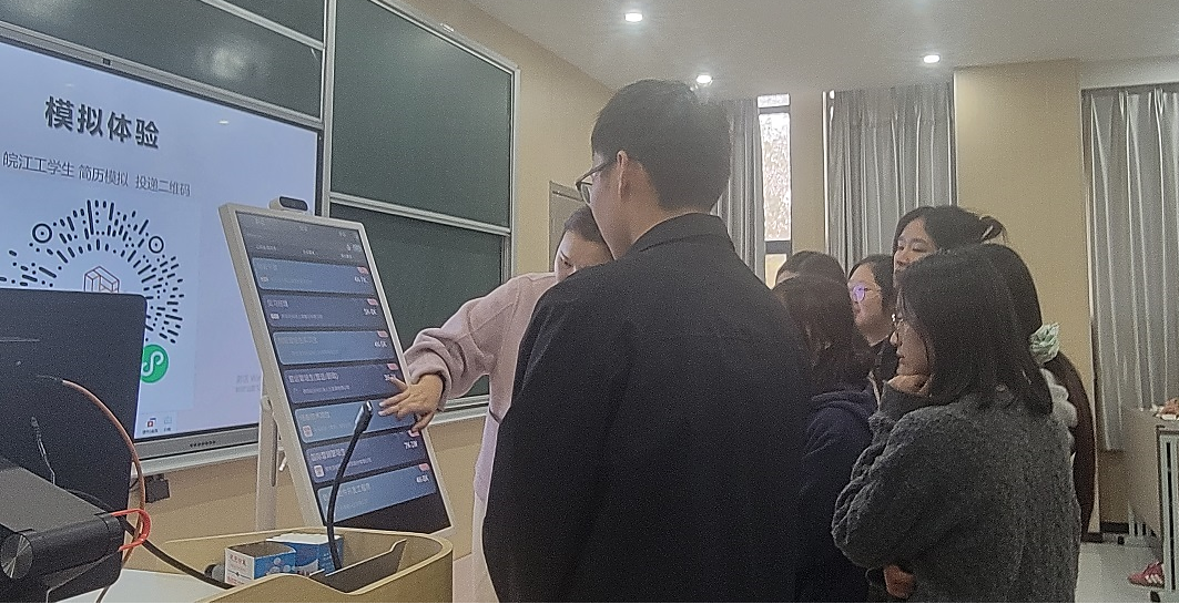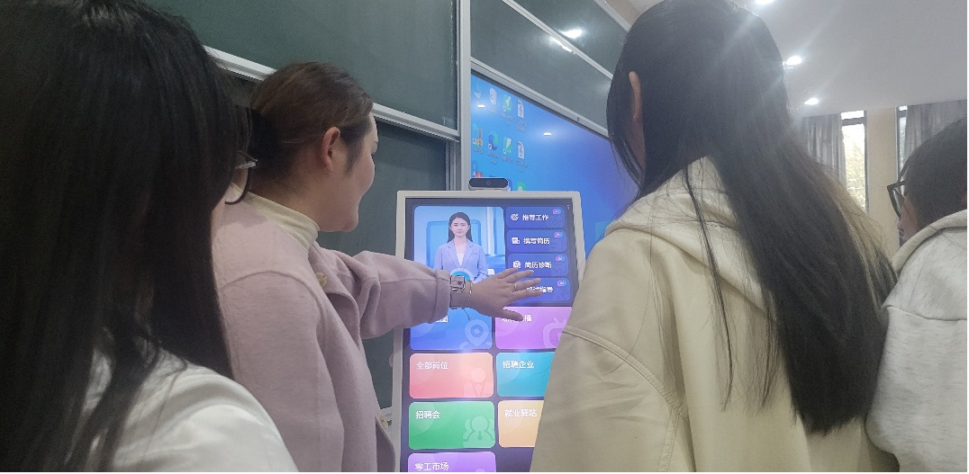 在讲座的互动与交流环节,红海公司同行的工作人员引导在场同学上台实际体验“AI交互机”的强大功能,现场气氛活跃,激发了学生强烈的好奇心与探究欲。由集团自主研发的“AI交互机”是红海公司目前最新的创新成果之一,其核心特色包括了AI语音简历撰写与诊断、模拟面试指导、语音交互精准匹配岗位等功能,属于一站式智能求职终端设备。