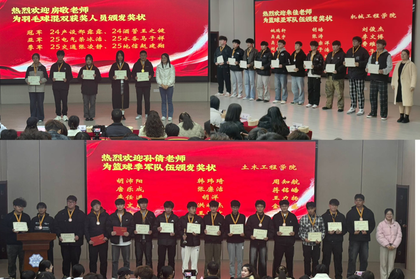 经过数周紧张激烈的角逐,备受瞩目的“2025第六届‘皖工杯’篮球、羽毛球、足球联赛”于11月20日圆满落下帷幕。当晚,伴随着热烈的掌声和欢呼声,“皖工杯”闭幕式在郑蒲港校区图书馆报告厅隆重举行了颁奖典礼,表彰在各项赛事中表现优异的集体和个人,为这场体育盛会画上完美句点。