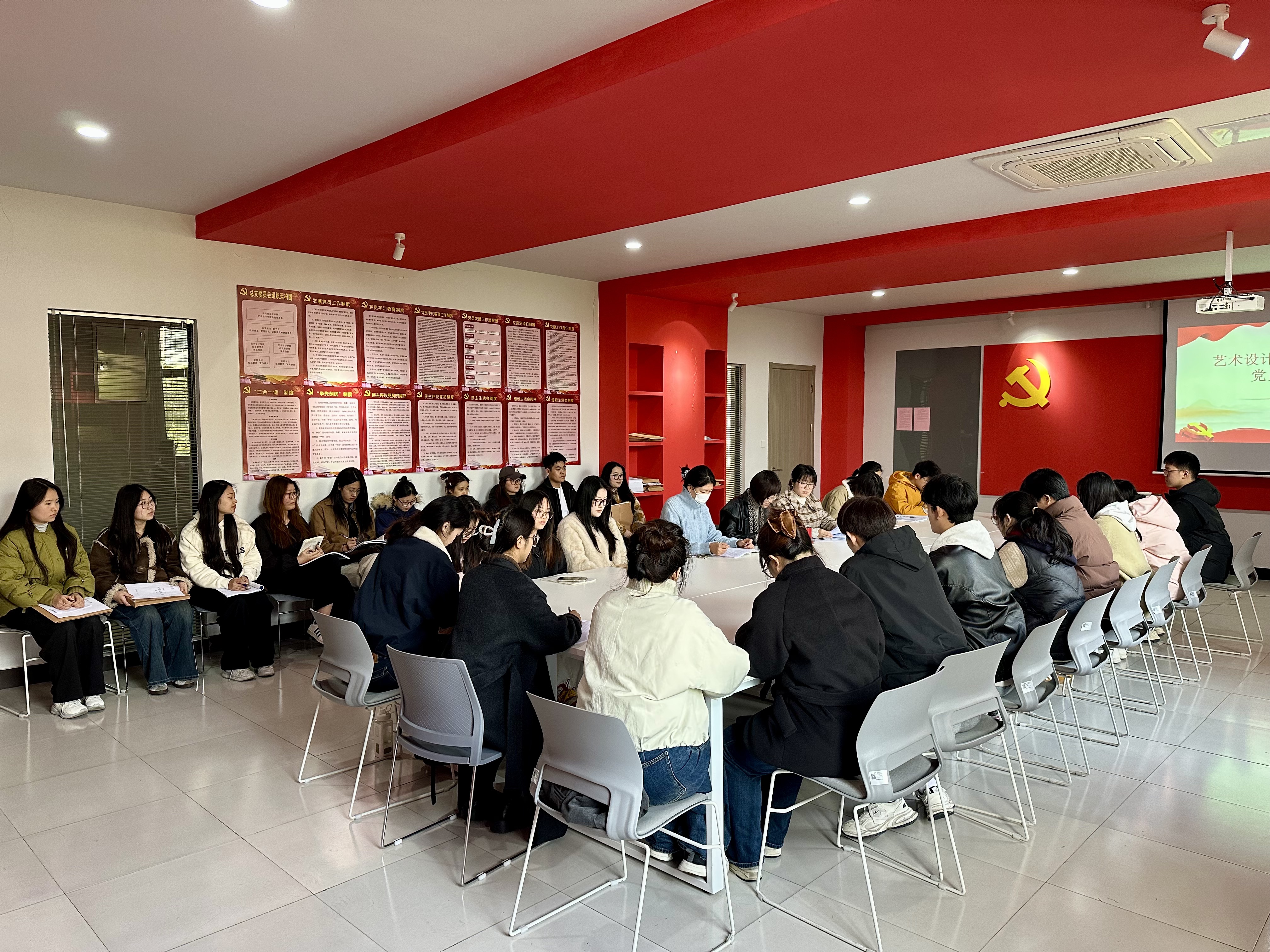 2025年11月24日,艺术设计学院学生党支部在洪雅楼党员活动室召开学生党支部党员发展大会,讨论了刘雨涵等8名同学的入党情况。党总支副书记程楠楠莅临会议指导工作,学生党支部全体党员参加会议,会议由学生党支部书记吴语嫣主持。
