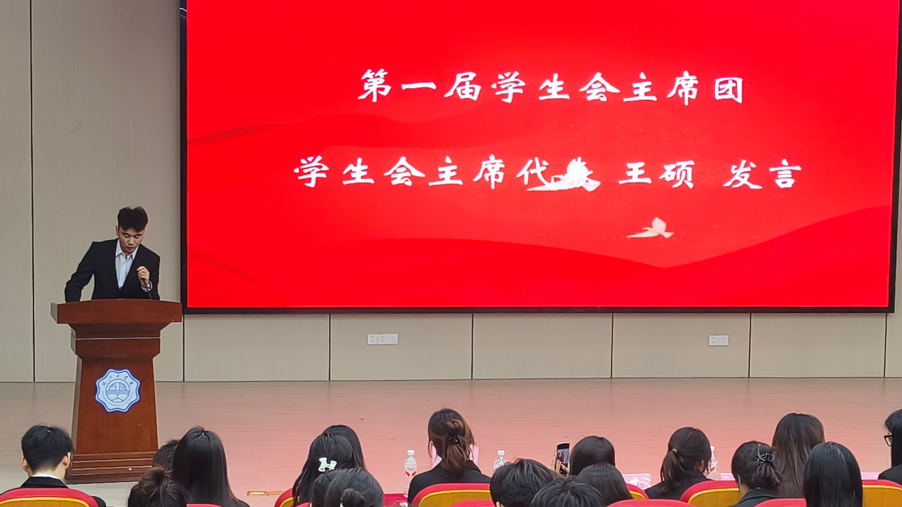 在工作总结汇报环节中,第一届学生会主席团代表王硕首先作述职报告。他系统回顾了学生会在过去一学年中的各项工作,全面总结了取得的主要成果与宝贵经验,并深情表达了对过去一年与各位同仁共同奋斗时光的怀念。
