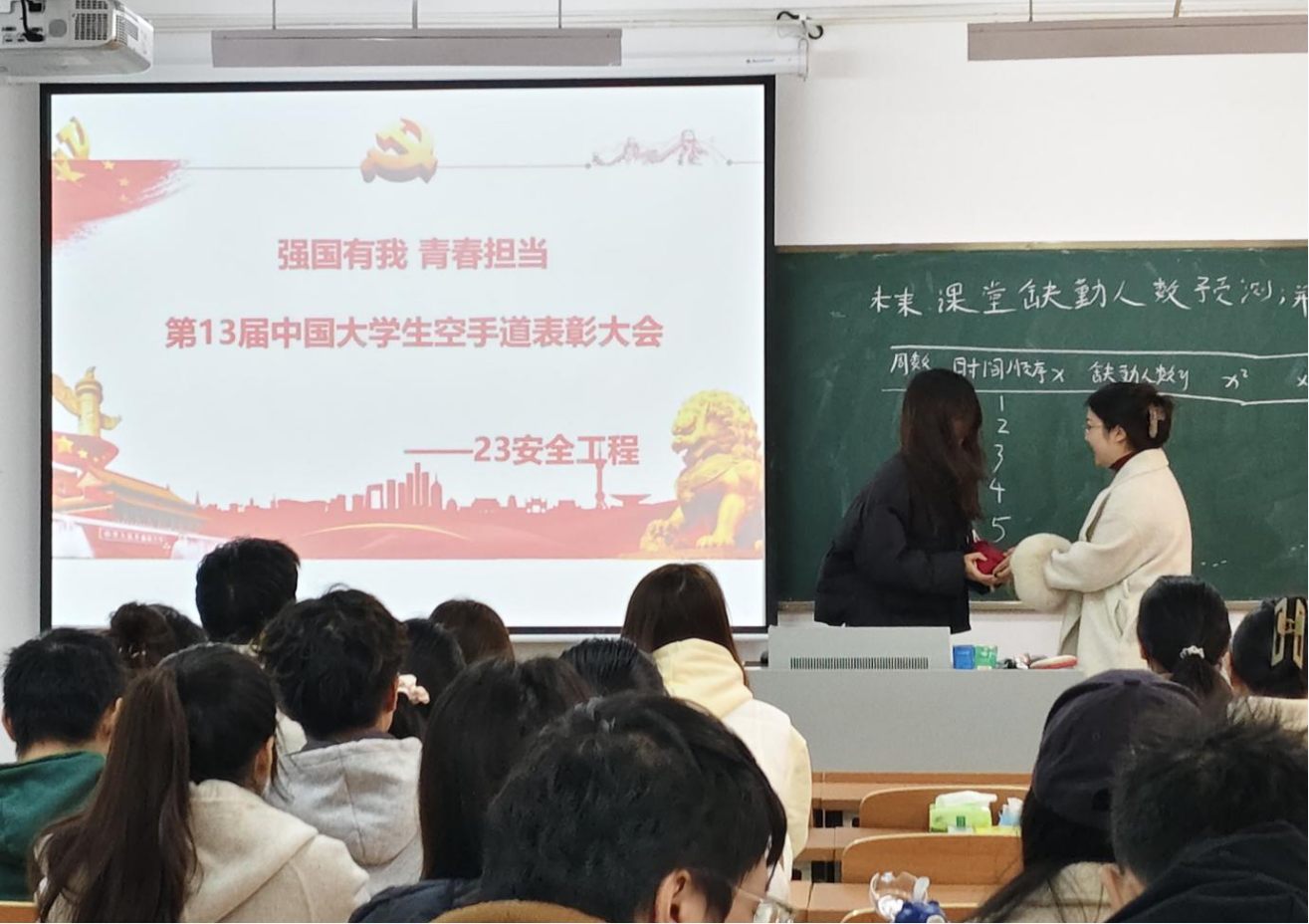 为表彰先进典型、弘扬体育精神,激发全体同学的拼搏热情与集体荣誉感,12月1日上午,土木工程学院2023级安全工程专业于水木楼北404教室召开“强国有我 青春担当”赛事表彰主题班会。班会由辅导员束露露、班主任周成颂共同主持,专业全体学生参加,重点表彰在《第十三届中国大学生空手道锦标赛》中斩获佳绩的李正义、戴子怡两位同学,分享他们的奋斗历程,传递顽强拼搏、全面发展的青春正能量。
