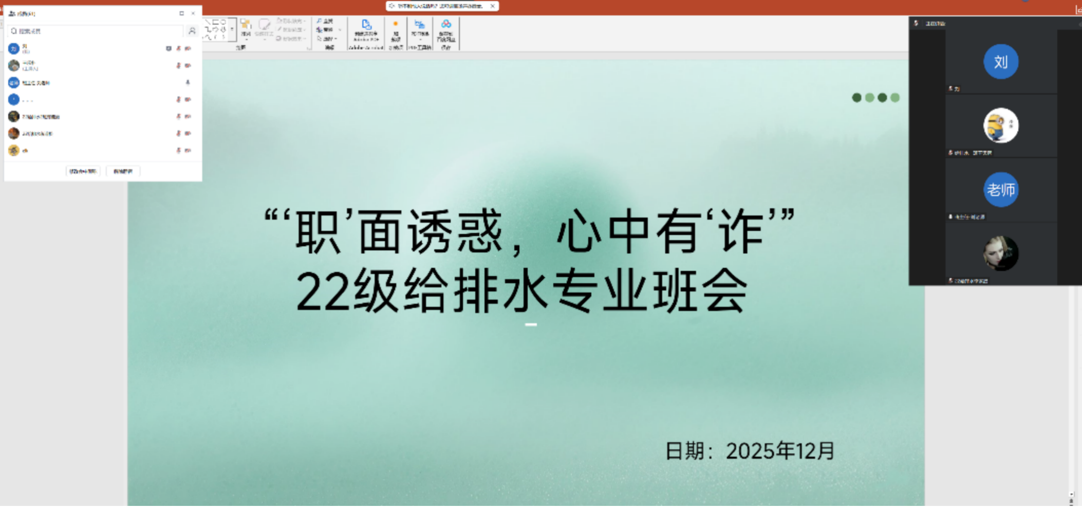 为增强应届毕业生求职安全防范意识,筑牢求职反诈思想防线,护航毕业生平稳有序就业,12月26日,土木工程学院2022级给排水科学与工程专业召开“职面诱惑,心中有‘诈’”求职反诈线上主题班会。班会由班主任刘瑞琳主持,专业全体学生参加。