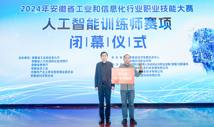 2024年,张利庭老师以一名普通选手的身份参加了安徽省工业和信息化行业职业技能大赛人工智能训练师赛项(职工组)。面对人工智能这一飞速发展的领域,他像初学者一样废寝忘食地研读前沿技术和算法逻辑,最终凭借过硬的职业素养在强手如云的赛事中脱颖而出,荣获职工组一等奖(第1名)。