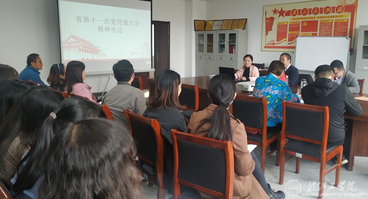 11月17日下午,基础部在E218召开全体教师大会,由今年会参加省代会的代表毕胜琴老师传达中国共产党安徽省第十一次代表大会精神。部党总支书记宋洪生、副主任吴云标及全体教师认真聆听了大会精神。