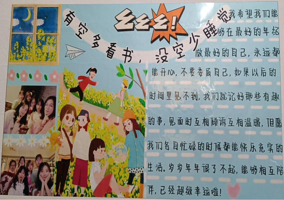 创建学生宿舍文化品牌既是一次同学情、宿舍爱的涌动,更是一次创造力、创新力的比拼。为展现自己宿舍特有的风格和特色,同学们在保证宿舍卫生和宿舍安全的前提下,积极发挥想象力和创造力,以海报、板报、文化小天地等精彩丰呈的形式,谱写宿舍“家训”、描绘卡通人物简画、张贴“全家福”...一张张笑脸仿佛星星般闪烁,仿佛正印证了那句“友谊面前,我们和星星一样,不是彼此妨碍,而是互相照耀”。