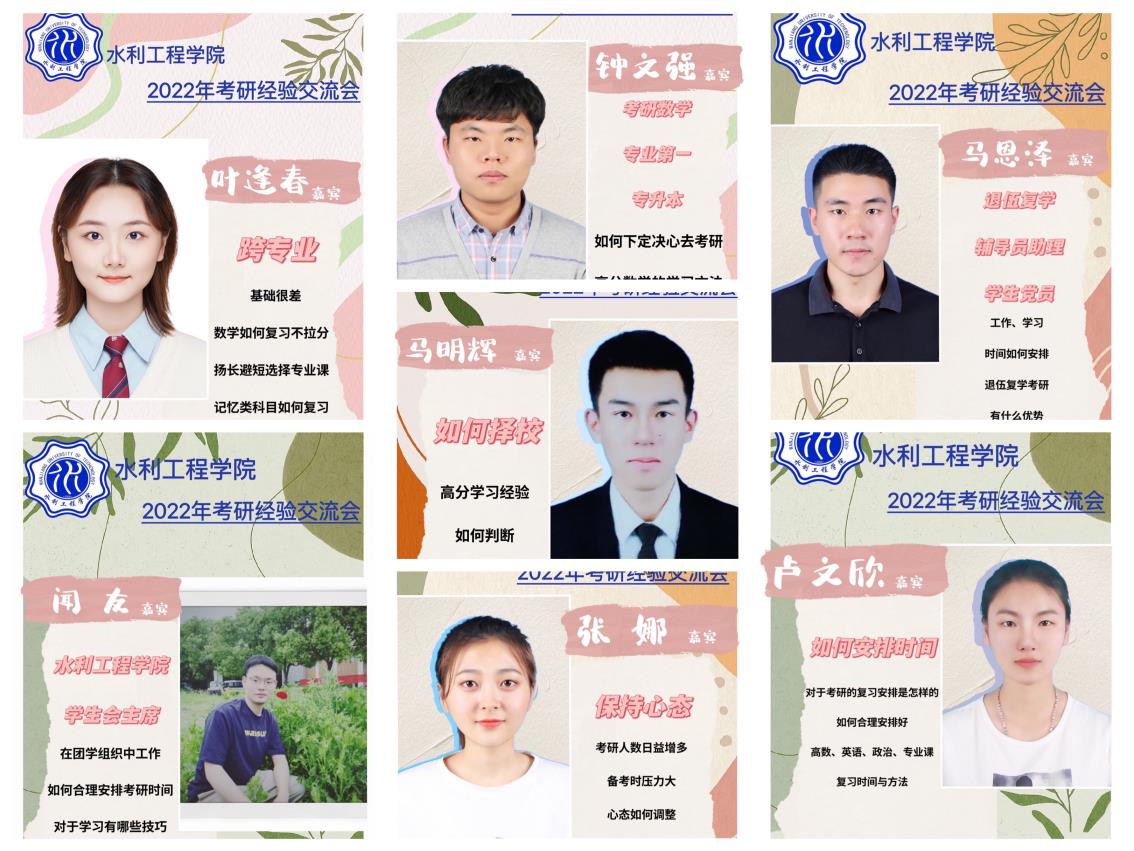 本次交流会邀请2018级水利水电工程专业钟文强、卢文欣、闻友;2018级港口航道与海岸工程专业马明辉;2018级水文与水资源工程专业马恩泽、叶逢春;2018级水务工程专业张娜等7名学生主讲嘉宾,分享考研学习方法与心路历程。