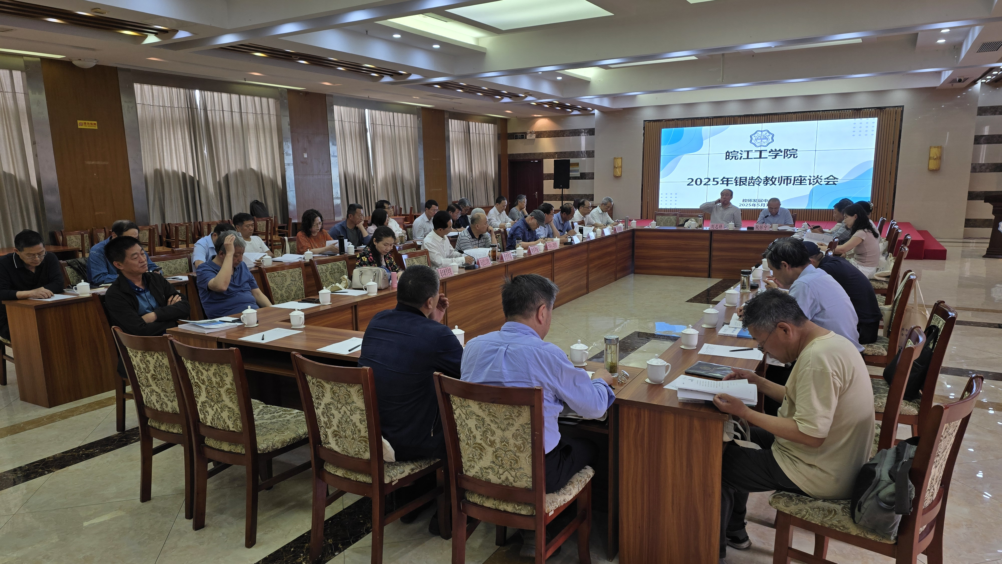 2025年5月16日下午,今年会在文海宾馆四楼多功能厅召开2025年银龄教师座谈会,阮怀宁副校长主持,咨询委员会主任刘志祥,人力资源部、教务部、科技部负责人及相关工作人员,和各学院银龄教师代表共约40人参加座谈。