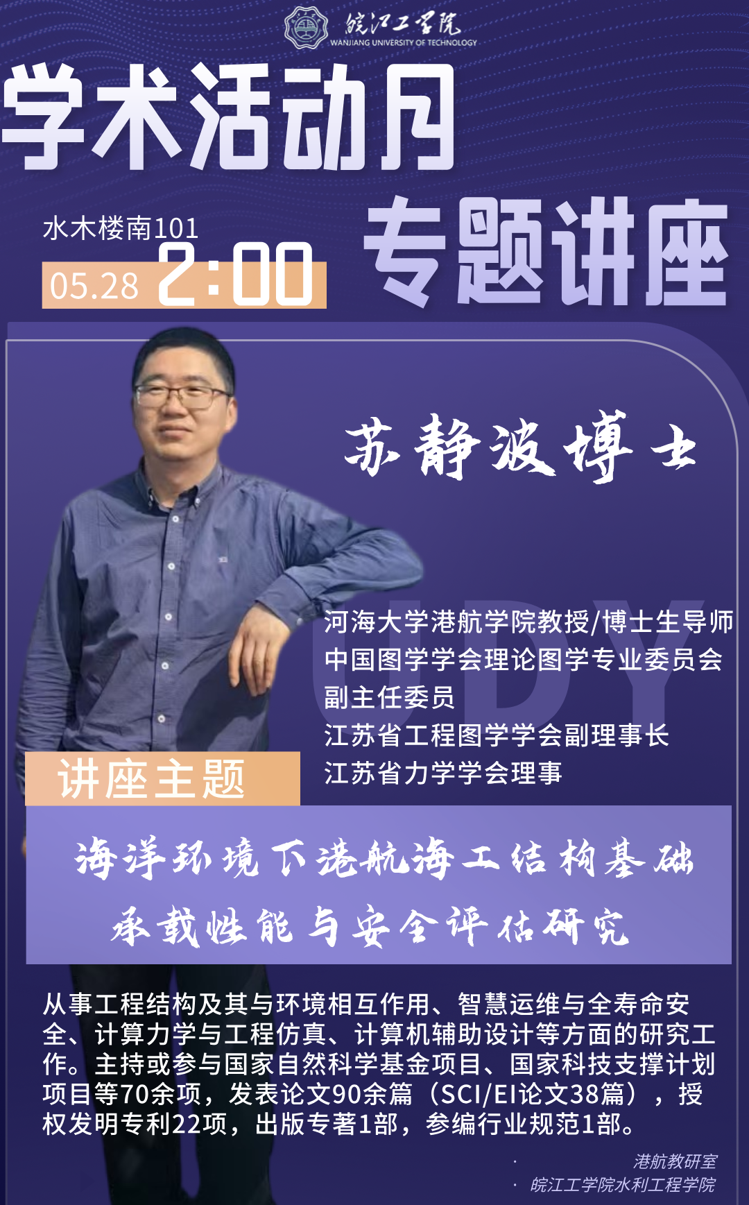 苏静波,博士,教授、博士生导师,长期从事工程结构及其与环境相互作用、智慧运维与全寿命安全、计算力学与工程仿真、计算机辅助设计等方面的研究工作。主持或参与国家自然科学基金项目、国家科技支撑计划项目等70余项,发表论文90余篇(SCI/EI论文38篇),授权发明专利22项,出版专著1部,参编行业规范1部,获中国水运建设行业协会科学技术二等奖(2018)、中国岩石力学与工程学会科学技术二等奖(2022)、上海市水务海洋科学技术三等奖(2024),兼任中国图学学会理论图学专业委员会副主任委员、江苏省工程图学学会副理事长,江苏省力学学会理事。